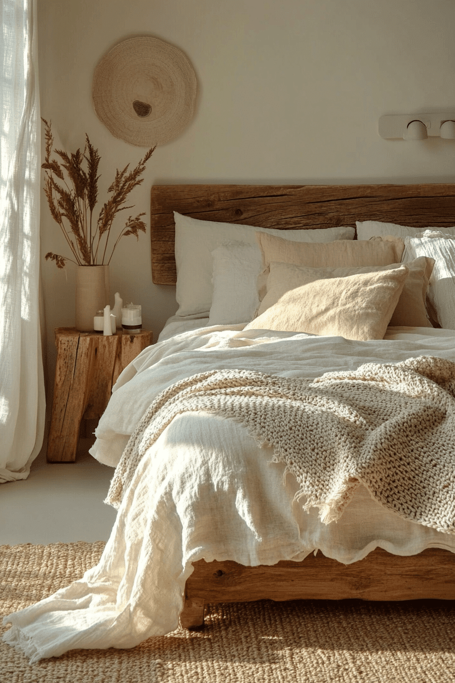 Visible wood grain adds authenticity to rustic boho bedroom ideas. Furniture pieces that highlight natural imperfections celebrate artisanal craftsmanship. These textures contrast beautifully with soft linens and airy curtains. The design feels rustic yet sophisticated. The bedroom becomes both stylish and relaxed. Explore rustic boho bedroom ideas that highlight natural wood grain.