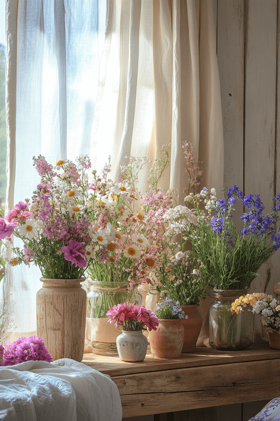 Brighten your home with vibrant wildflower displays, a perfect touch for rustic spring home decor ideas. Gather blooms from your garden and arrange them in simple wooden crates or ceramic jugs for a natural look. These arrangements bring the outdoors inside, creating a cheerful and welcoming vibe. They’re an affordable way to celebrate spring’s beauty in any room.