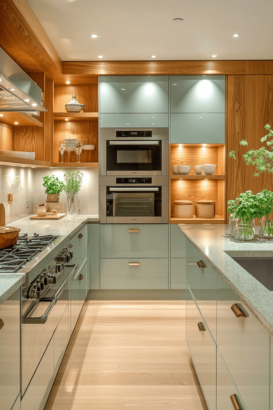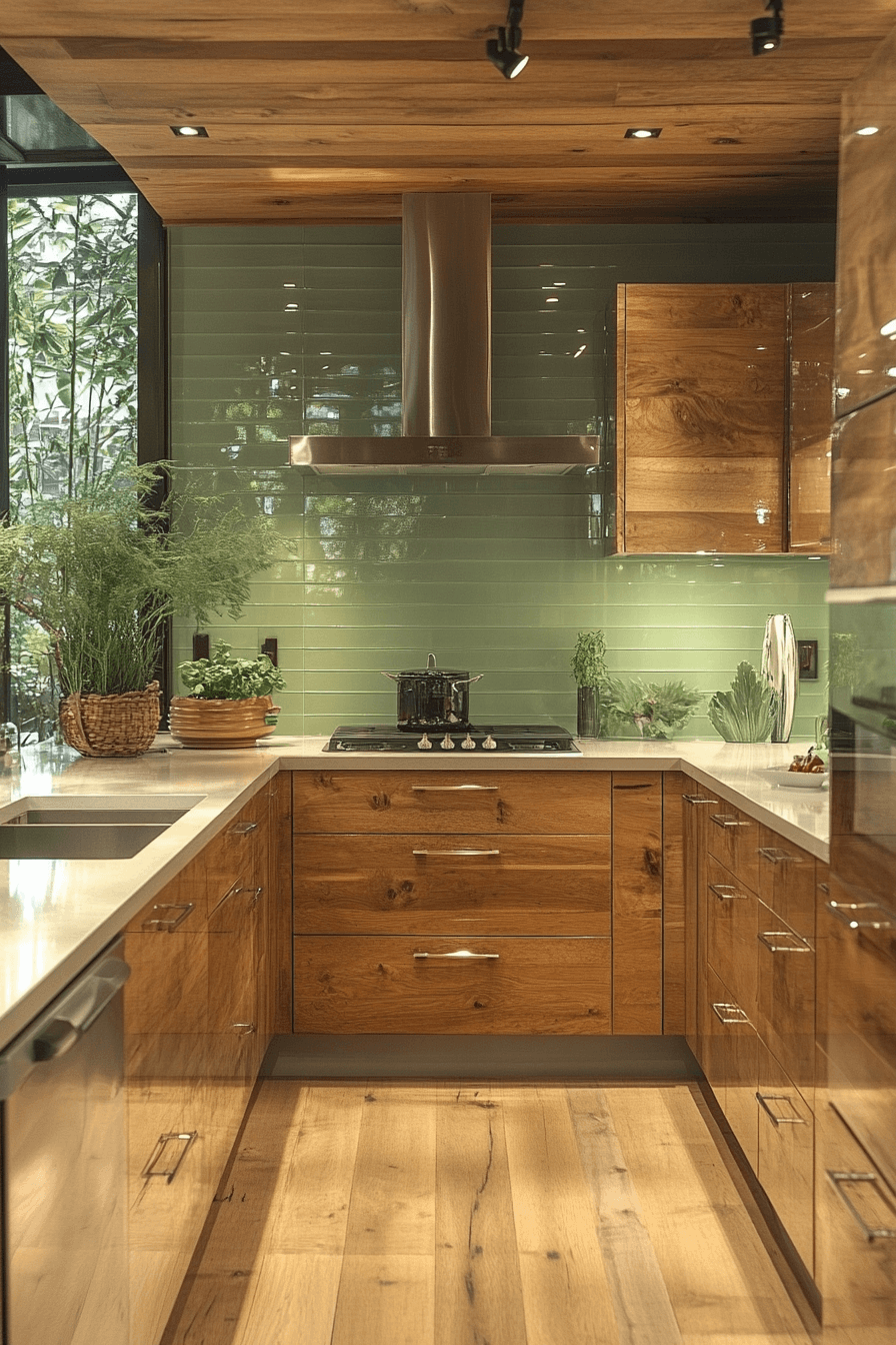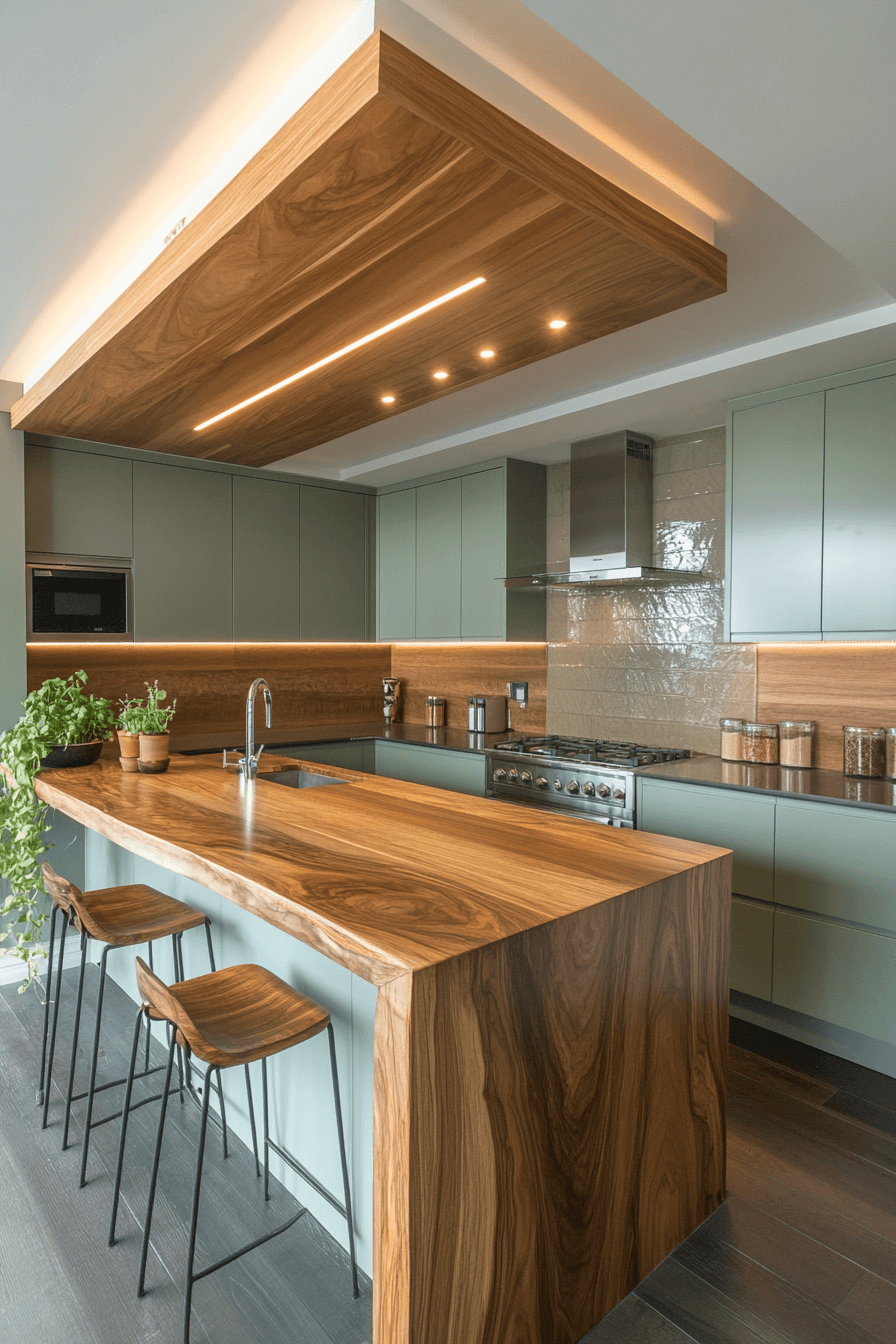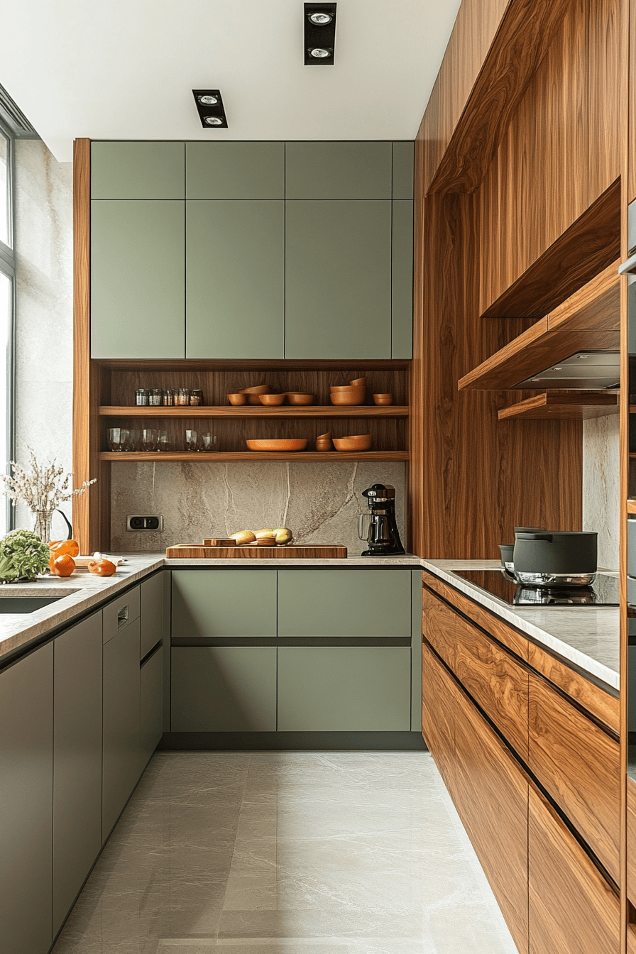 Wood framing adds subtle structure to this sage green and wood kitchen without overpowering it. Sage cabinetry softens the architectural lines. The contrast feels tailored and confident. The overall look is composed and high-end. This design appeals to lovers of clean, modern kitchens.