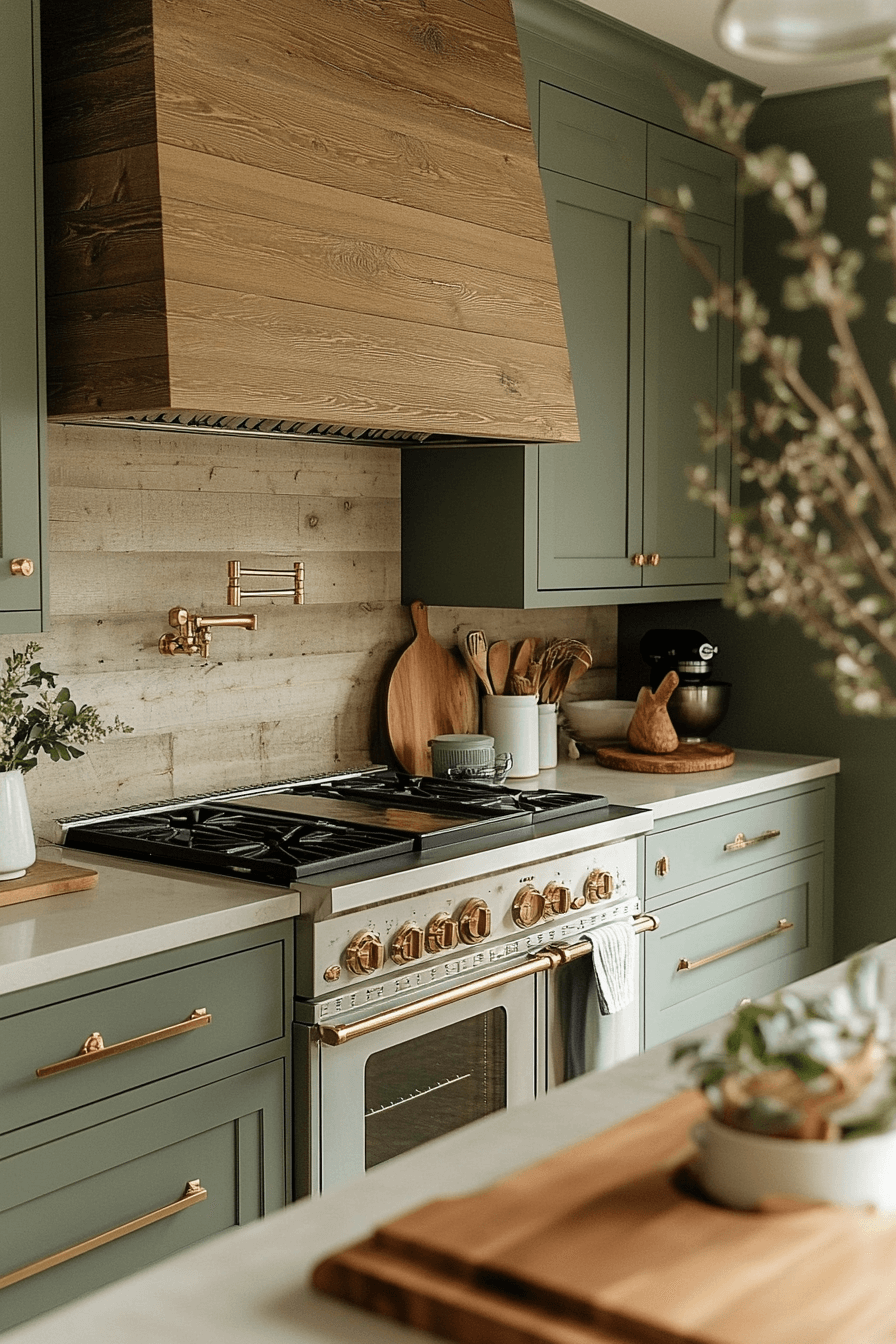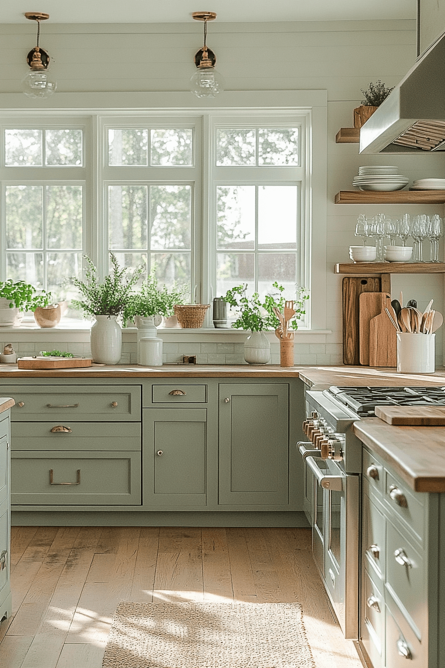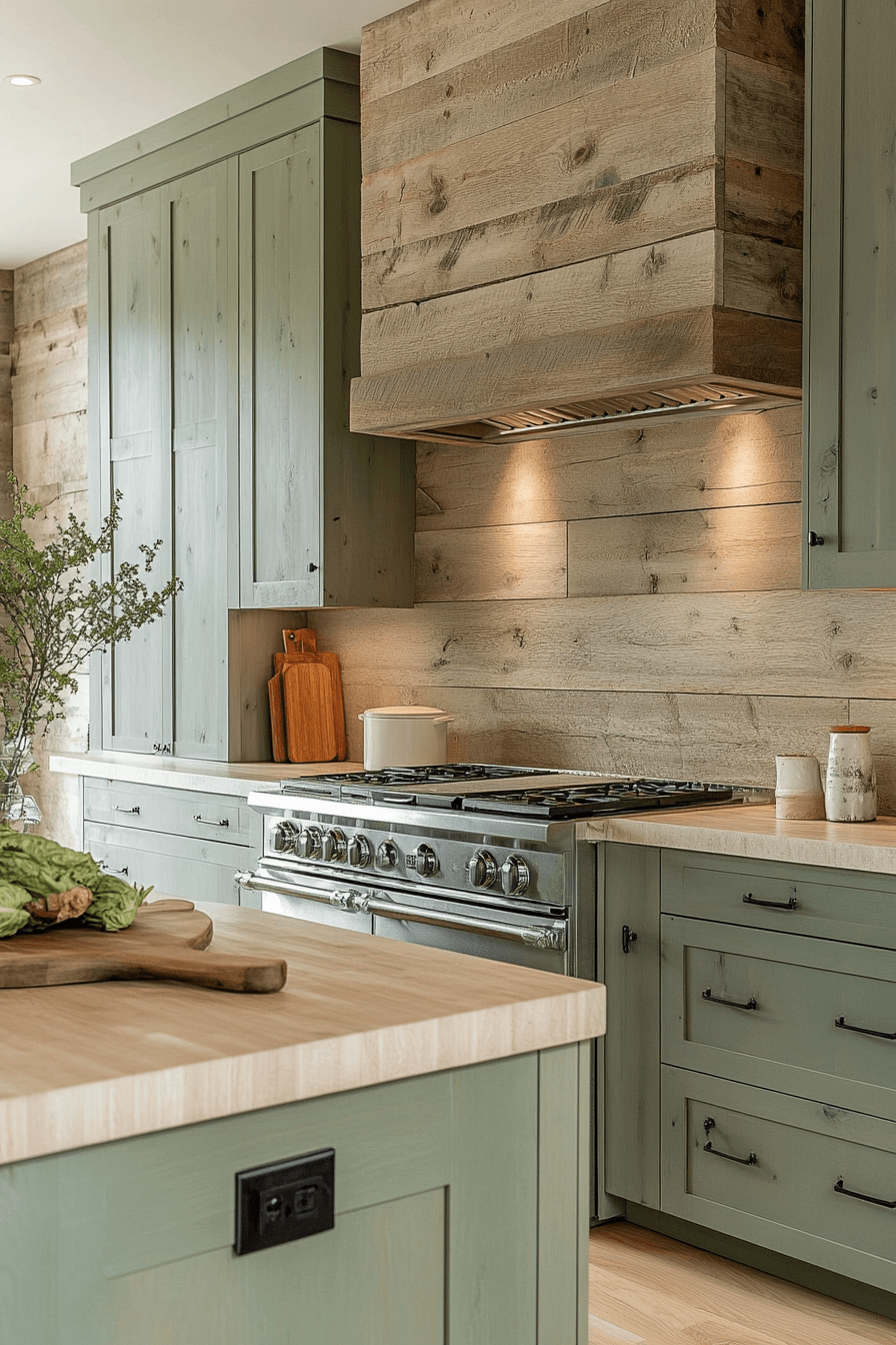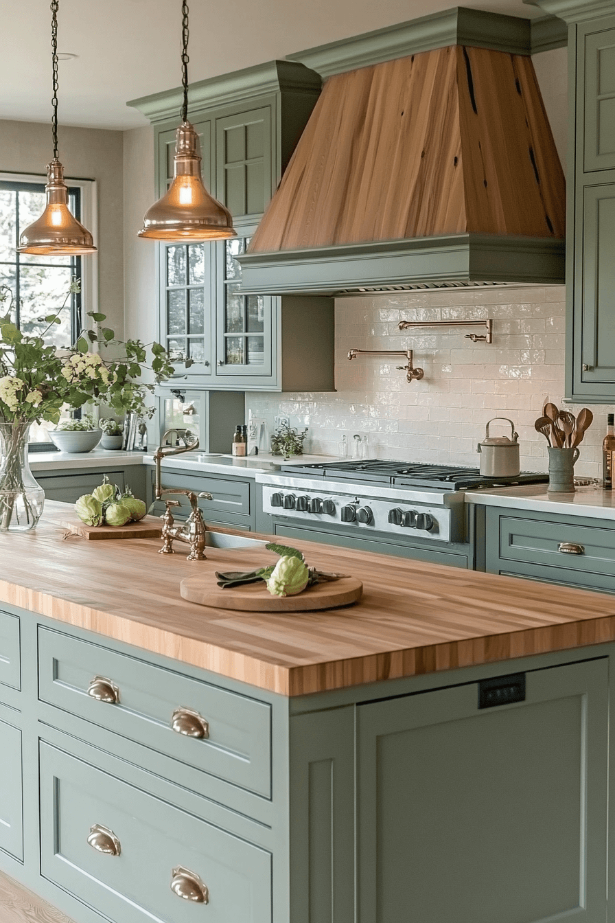 Subdued sage tones create a calm foundation in this thoughtfully detailed kitchen. Wood accents introduce rhythm and warmth throughout the space. The muted palette allows lighting and metal finishes to shine subtly. The atmosphere feels composed and timeless. This kitchen offers endless styling flexibility.
