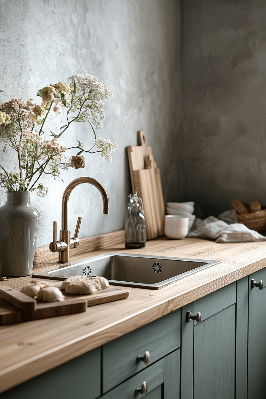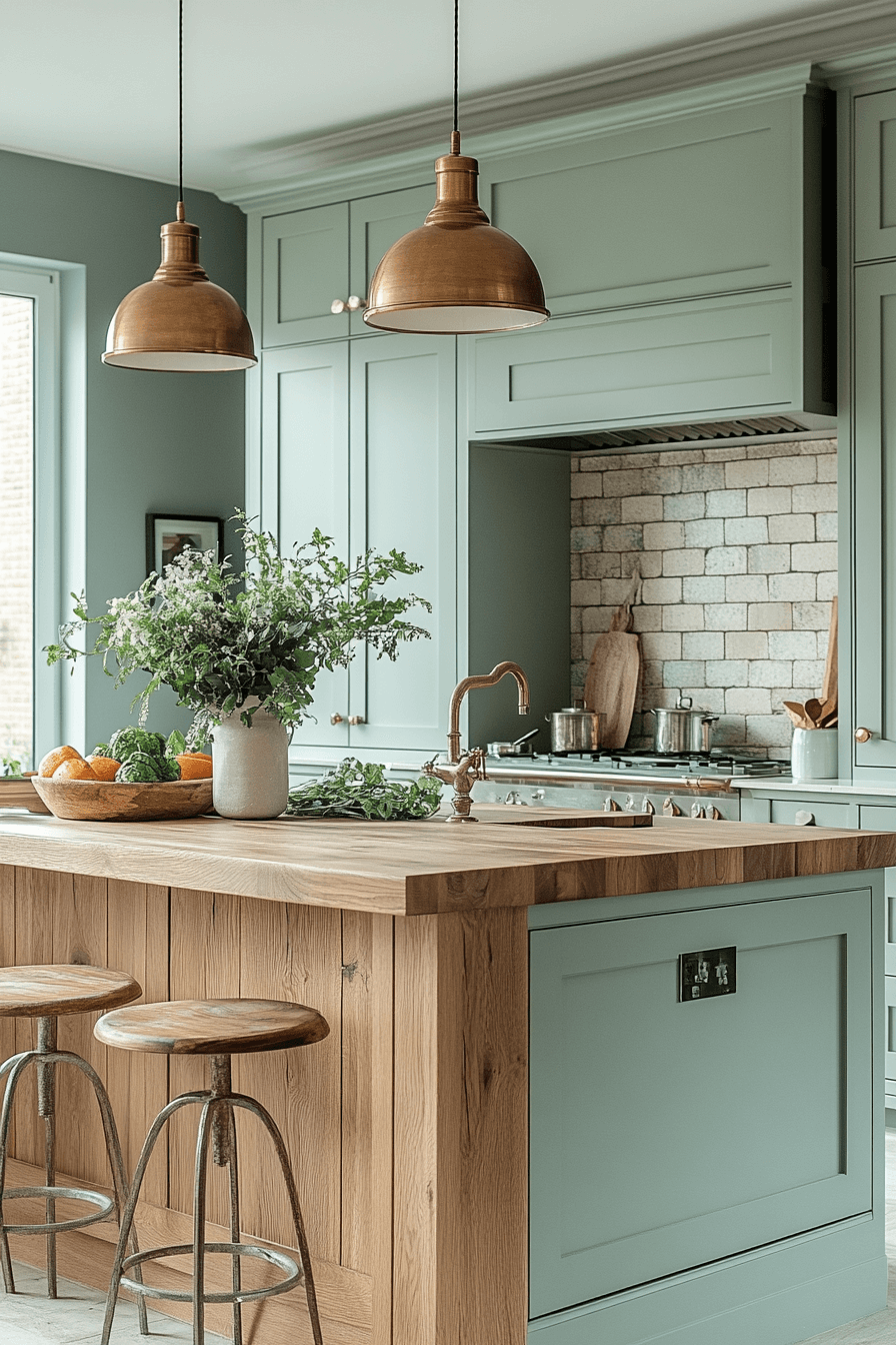 This sage green and wood kitchen achieves balance through carefully layered textures and tones. Cool green cabinetry and warm wood elements complement each other beautifully. The design feels current while remaining timeless. Every surface works together to create cohesion from floor to ceiling. The space feels intentional and calm.