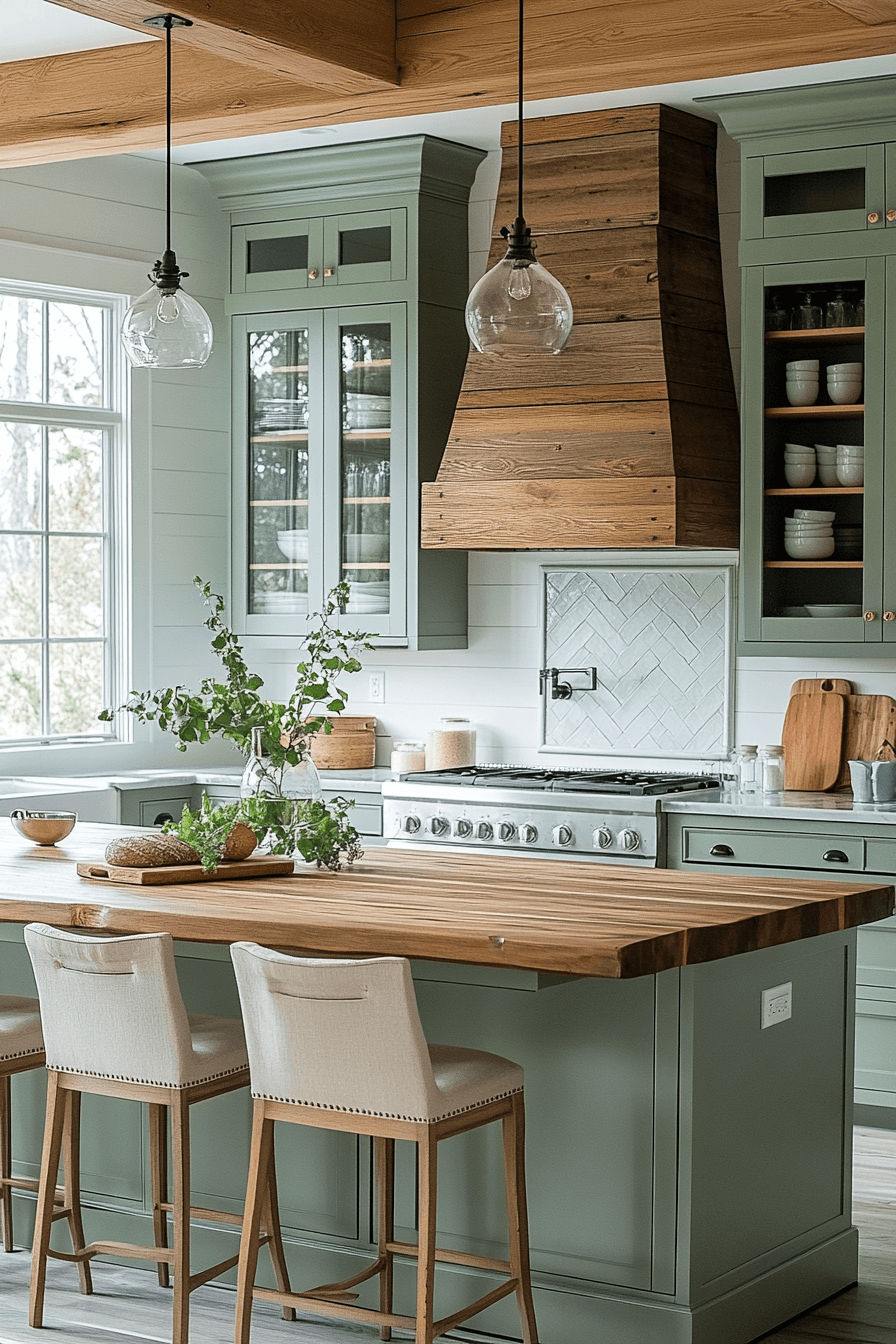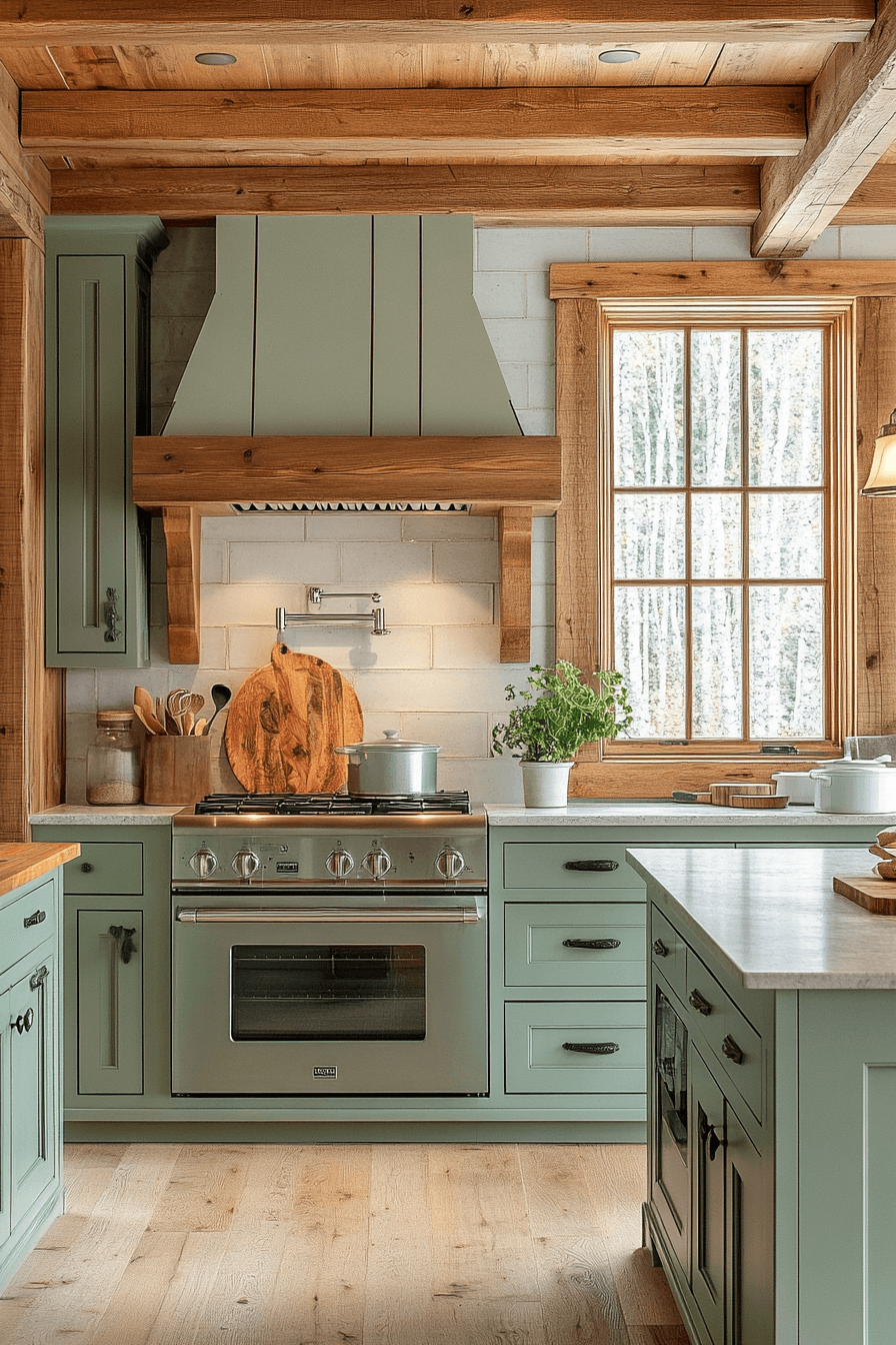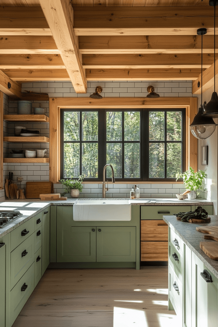 Wood framing on cabinets or ceilings gives this sage green and wood kitchen architectural presence. Sage adds color while wood defines structure. The balance feels intentional and well-proportioned. This design works especially well in airy or high-ceiling spaces. The kitchen feels built to last.