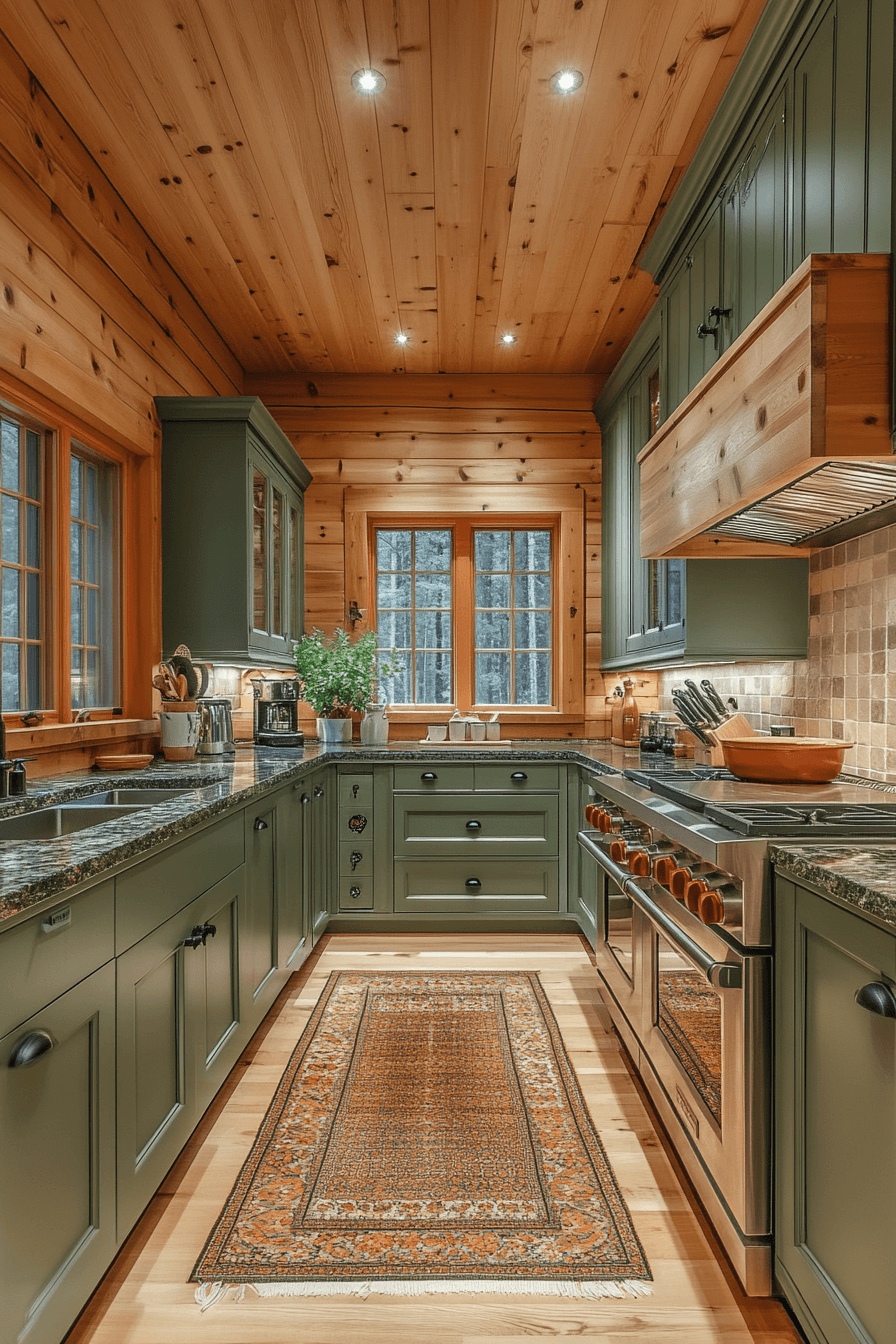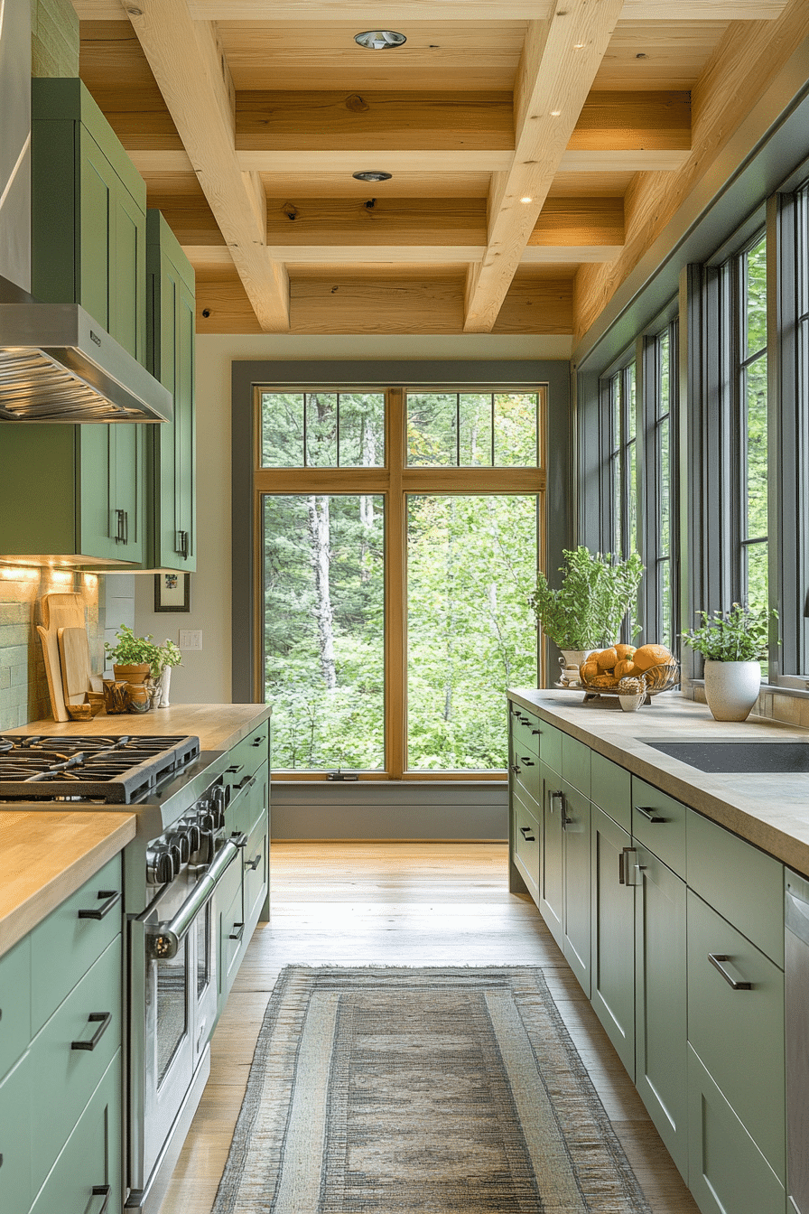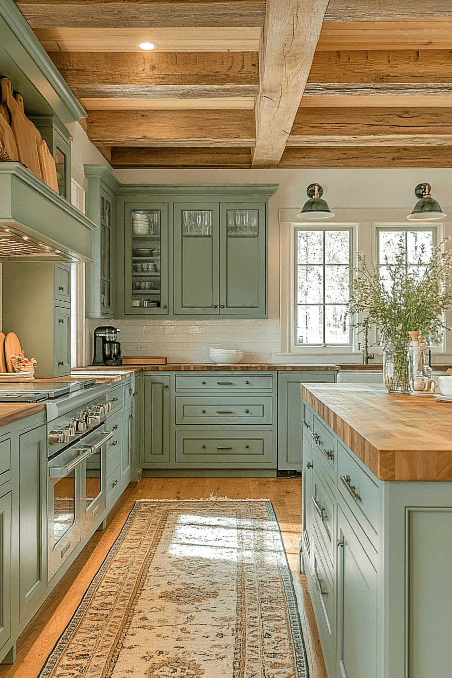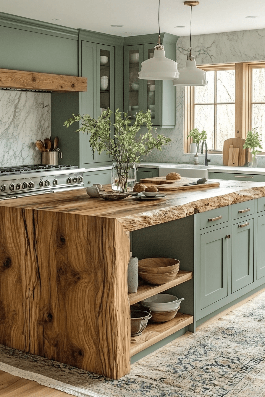 Wood framing on cabinets or ceilings gives this sage green and wood kitchen architectural presence. Sage adds color while wood defines structure. The balance feels intentional and well-proportioned. This design works especially well in airy or high-ceiling spaces. The kitchen feels built to last.