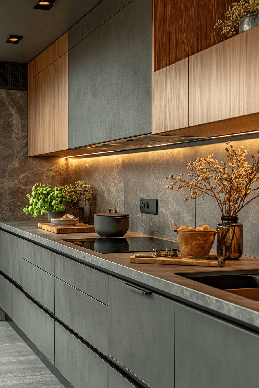 This contemporary sage green and wood kitchen uses symmetry and texture to create a refined atmosphere. Sage cabinetry pops against warm wooden drawers arranged in clean lines. The layout feels structured without being rigid. The combination feels modern yet inviting. Every element appears purposeful.