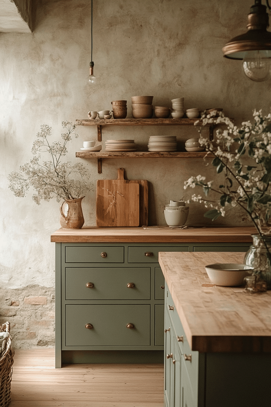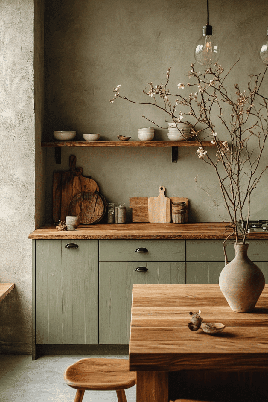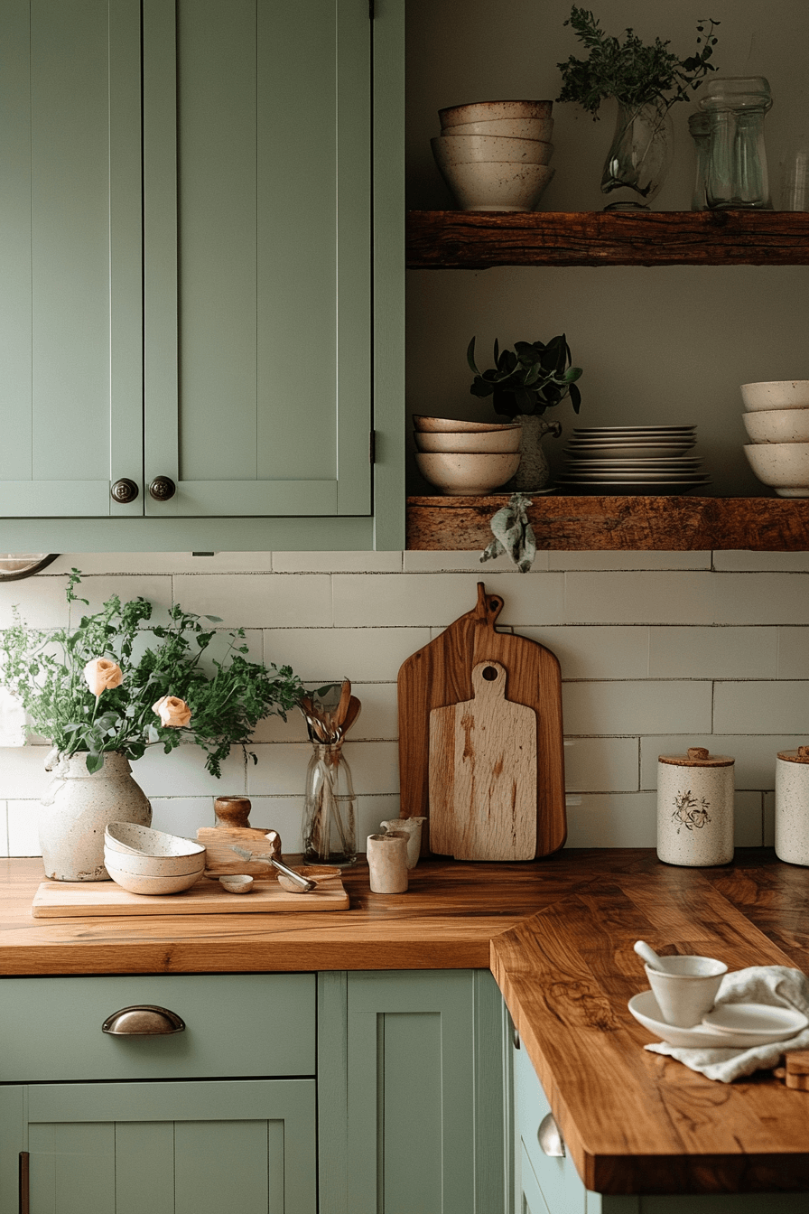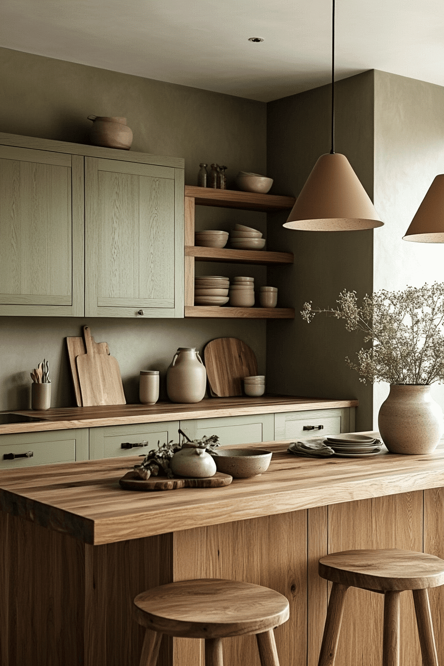This sage green and wood kitchen design creates a beautiful sense of balance by pairing soft green cabinetry with natural wood textures. The sage tone feels calm and grounding, while the wood adds warmth and organic character. Modern flat-front cabinets and smooth countertops keep the look refined and uncluttered. Open wood shelving adds visual interest while remaining practical for everyday use. The overall palette feels serene, intentional, and timeless.