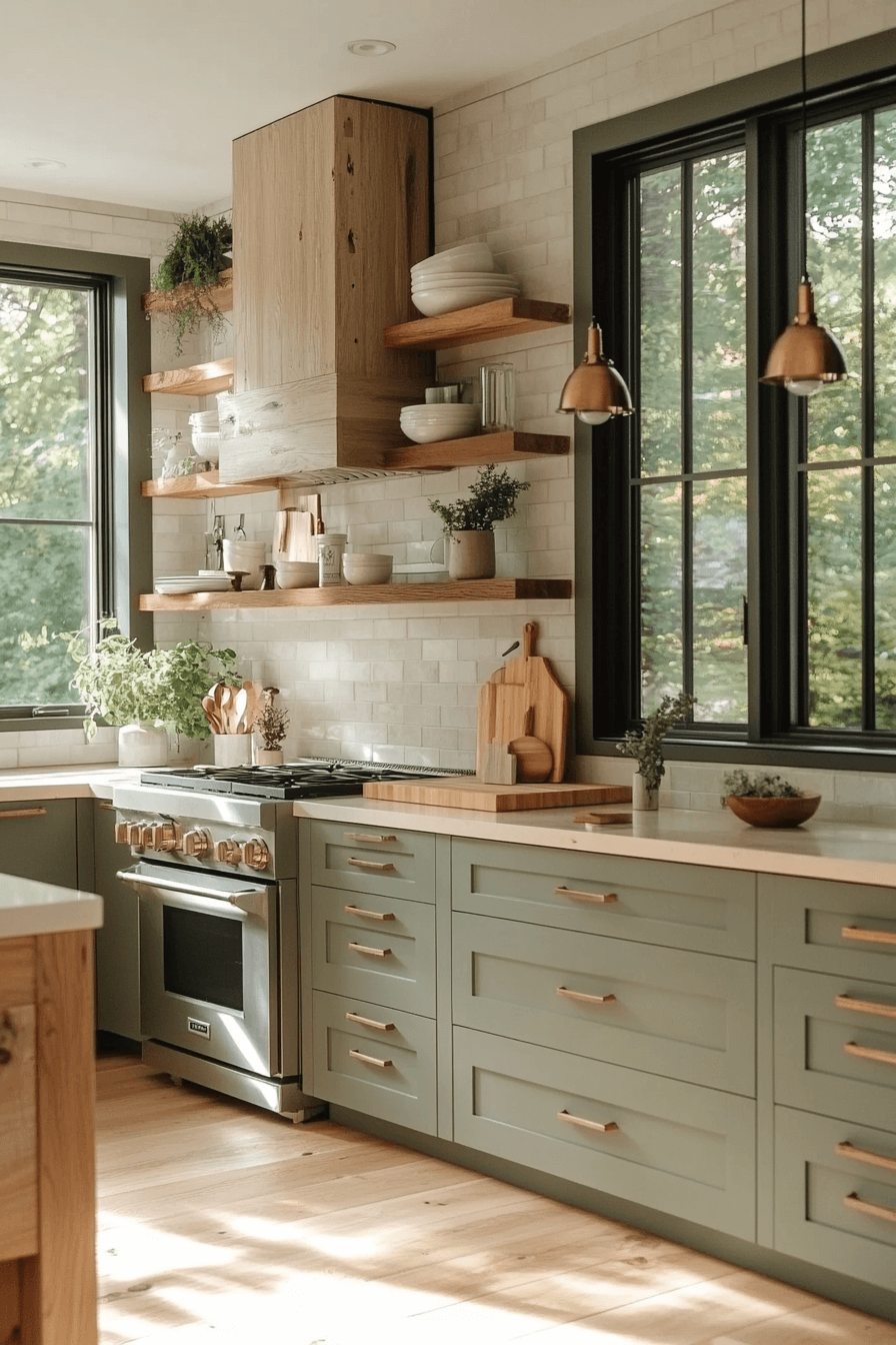 Elegant finishes define this sage green and wood kitchen, where color and texture work in harmony. Recessed sage cabinetry feels elevated and modern. Light timber floors and shelving add warmth and dimension. The design feels cohesive and carefully curated. Every detail supports a polished aesthetic.