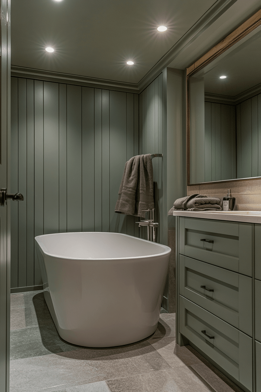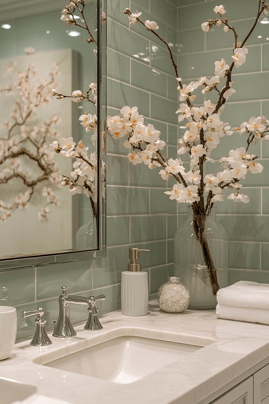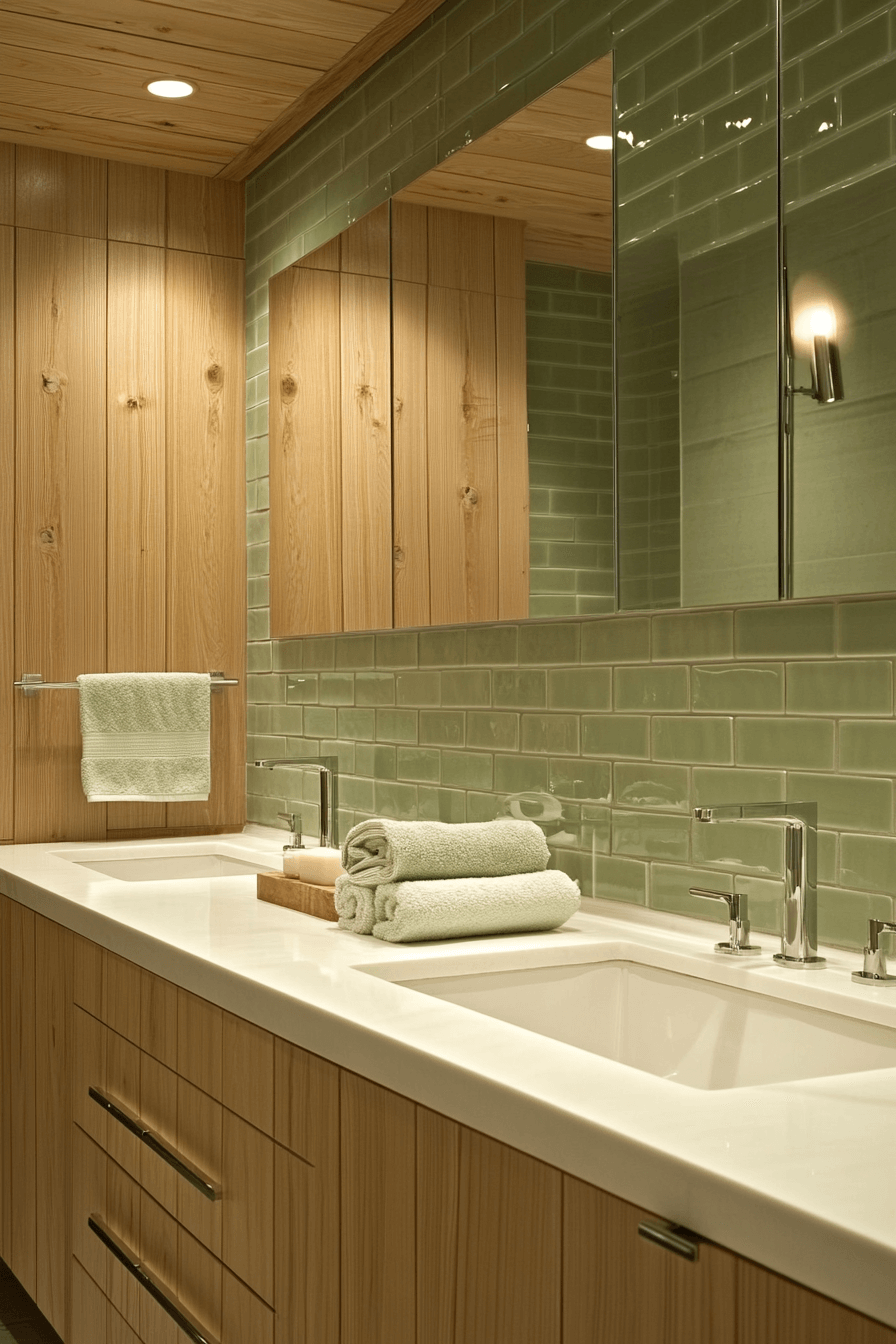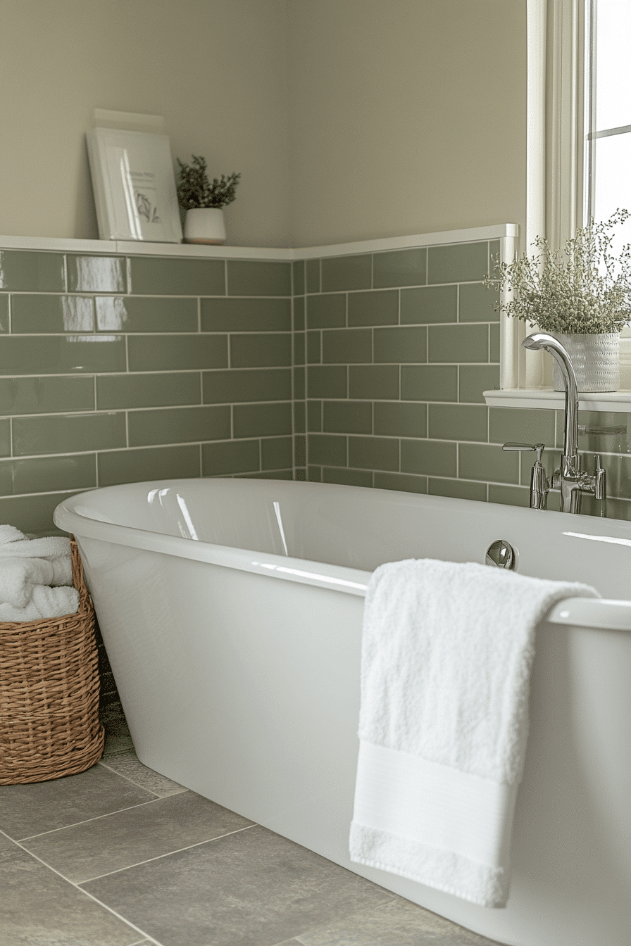 Vertical sage tiles introduce height and calm movement within the bathroom. These sage green bathroom ideas subtly reshape the space while adding gentle texture. Tall mirrors and streamlined storage reinforce the vertical flow. Neutral flooring keeps the look balanced. Soft lighting emphasizes the tile rhythm.