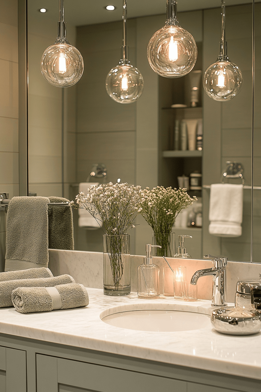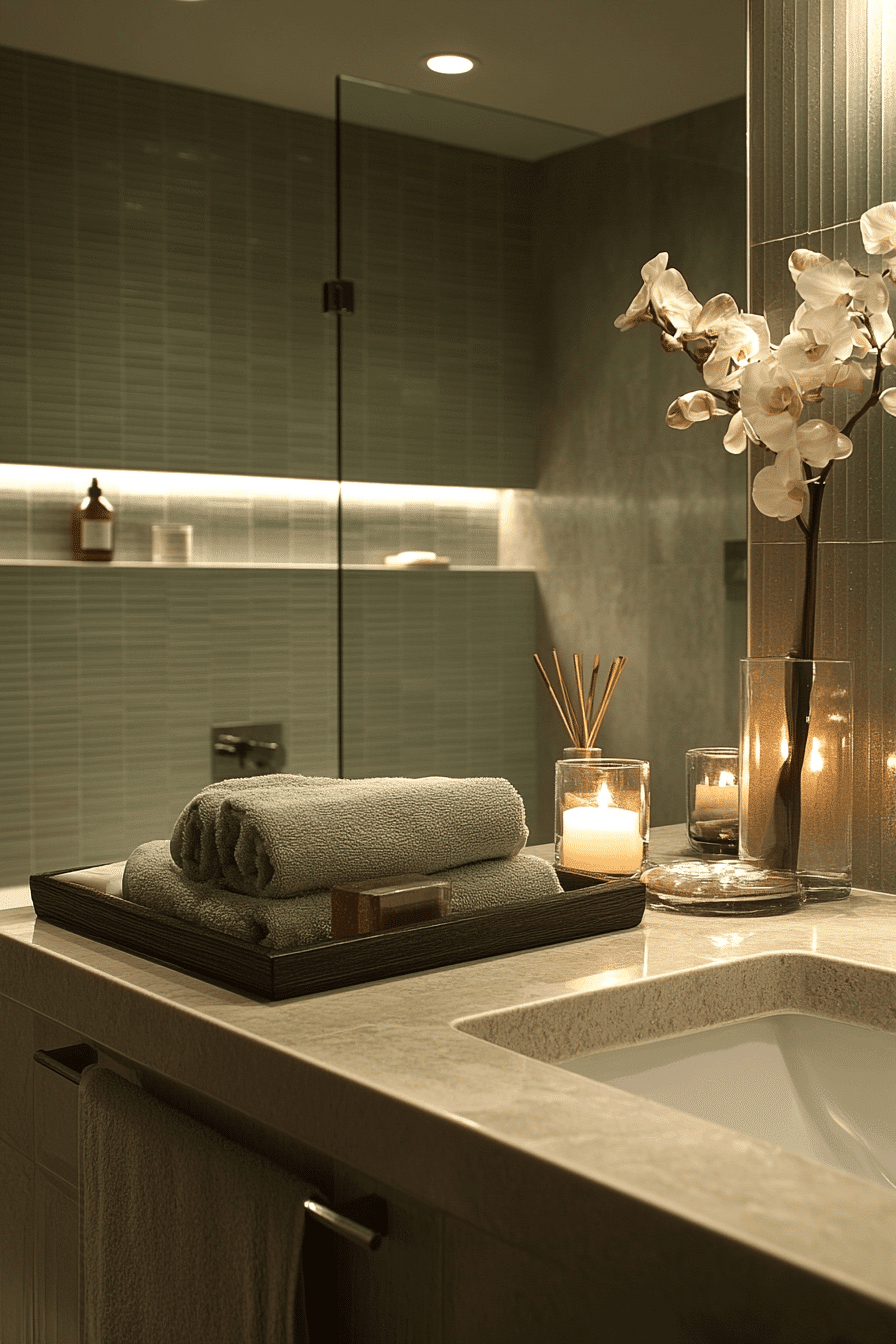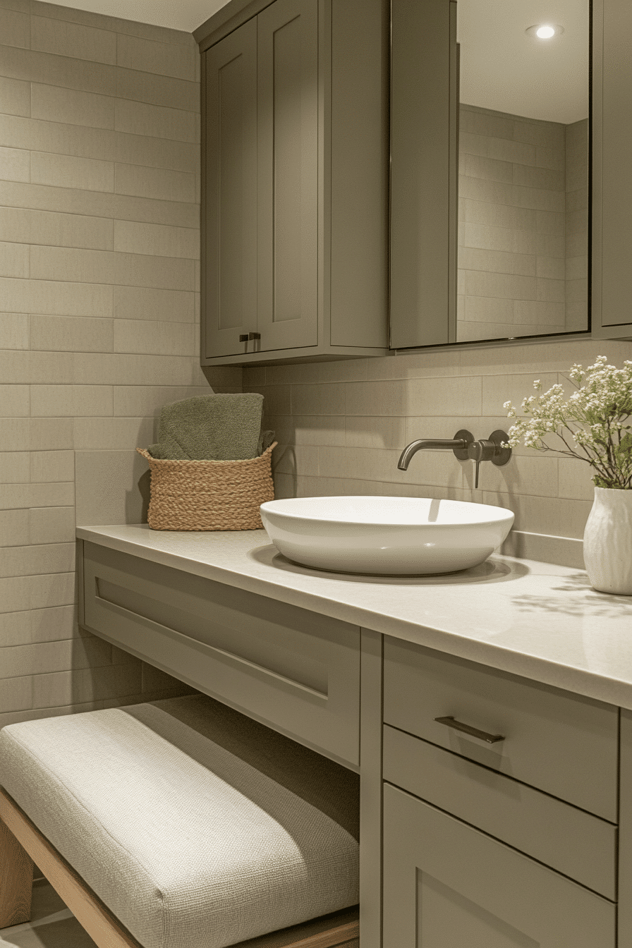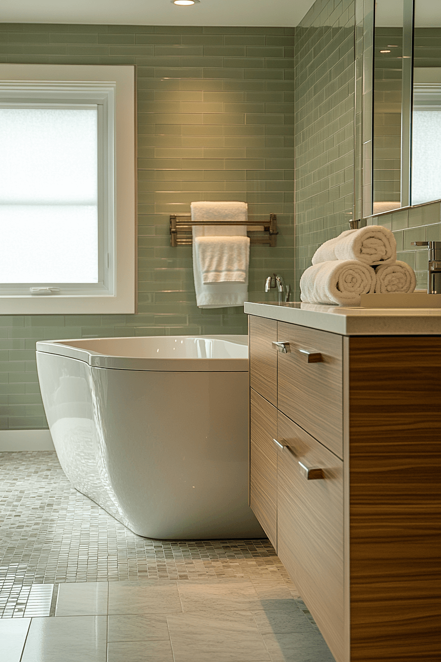 Vertical sage tiles introduce height and calm movement within the bathroom. These sage green bathroom ideas subtly reshape the space while adding gentle texture. Tall mirrors and streamlined storage reinforce the vertical flow. Neutral flooring keeps the look balanced. Soft lighting emphasizes the tile rhythm.