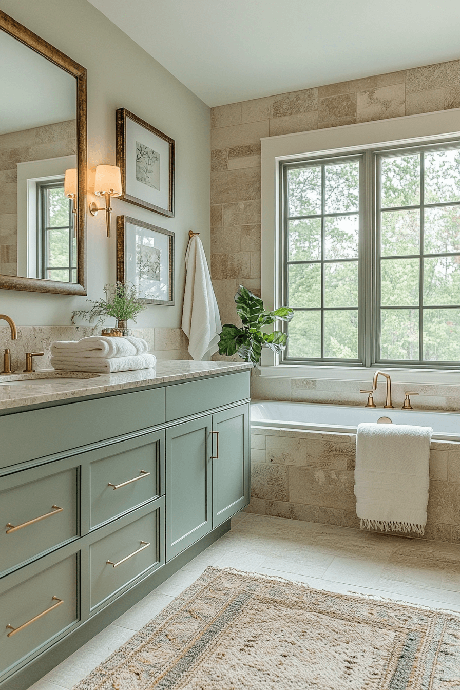 Stone countertops paired with sage green vanities deliver grounded luxury that never feels overdone. These sage green bathroom ideas are especially enduring for homeowners drawn to timeless finishes. Honed or matte stone surfaces enhance cohesion throughout the space. Statement mirrors or subtle stone backsplashes add refinement. Soft lighting completes the composition.