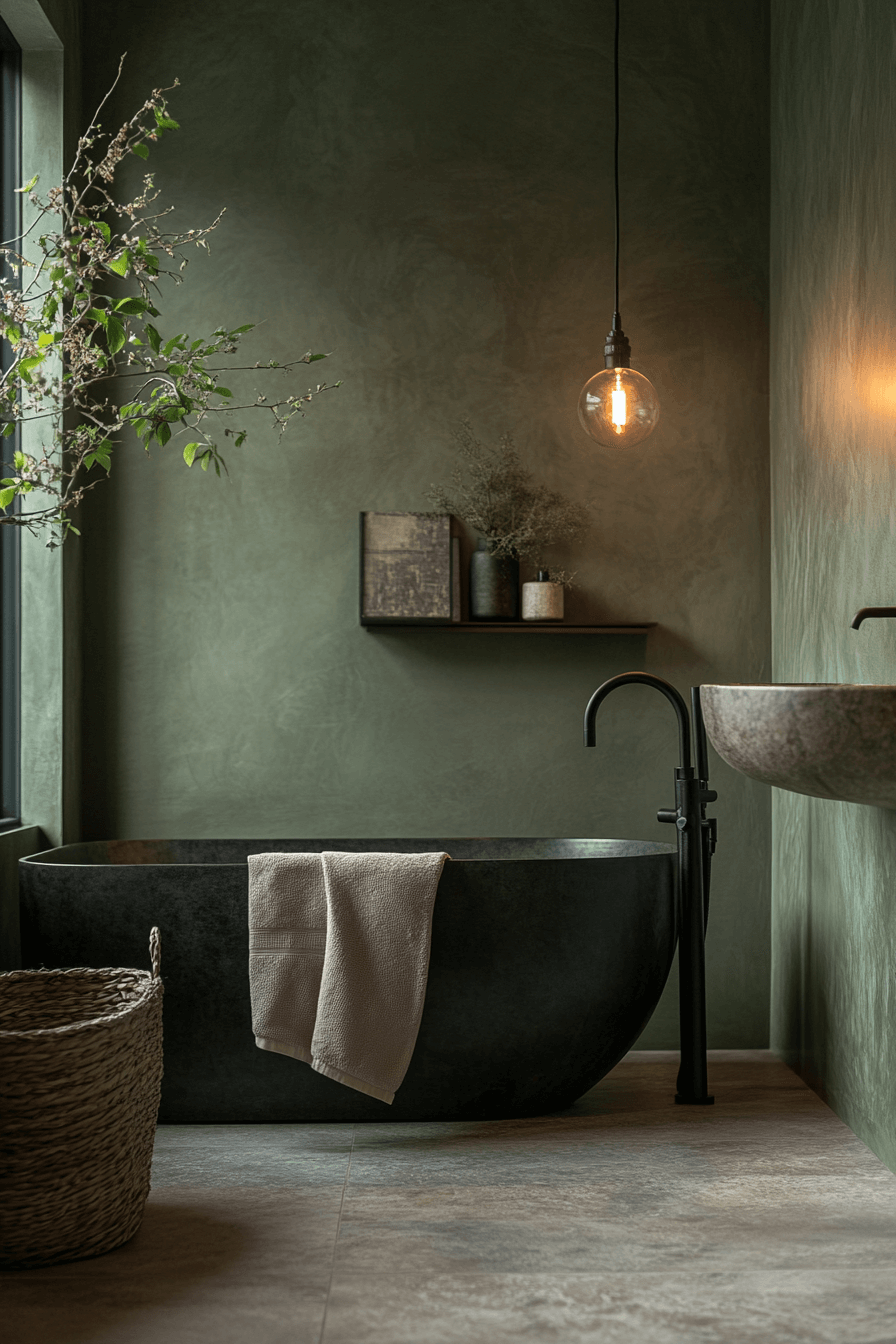 Deep sage walls paired with low lighting create an intimate, cocoon-like bathroom retreat. These sage green bathroom ideas feel especially inviting when paired with stone basins and dark cabinetry. Matte finishes soften the depth of color. Focused lighting enhances mood while remaining practical. The result is modern and grounded.