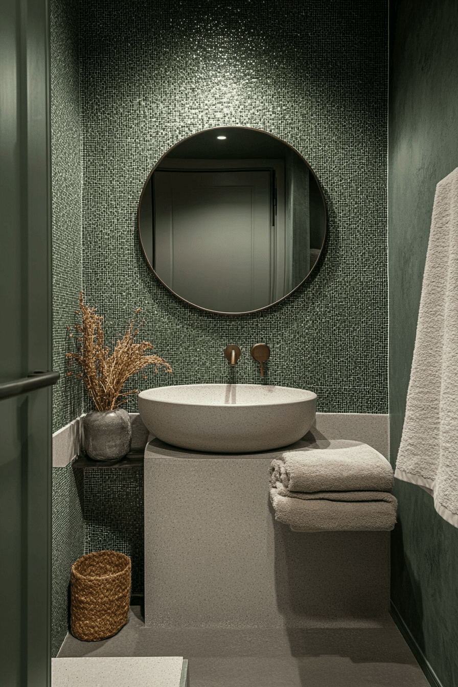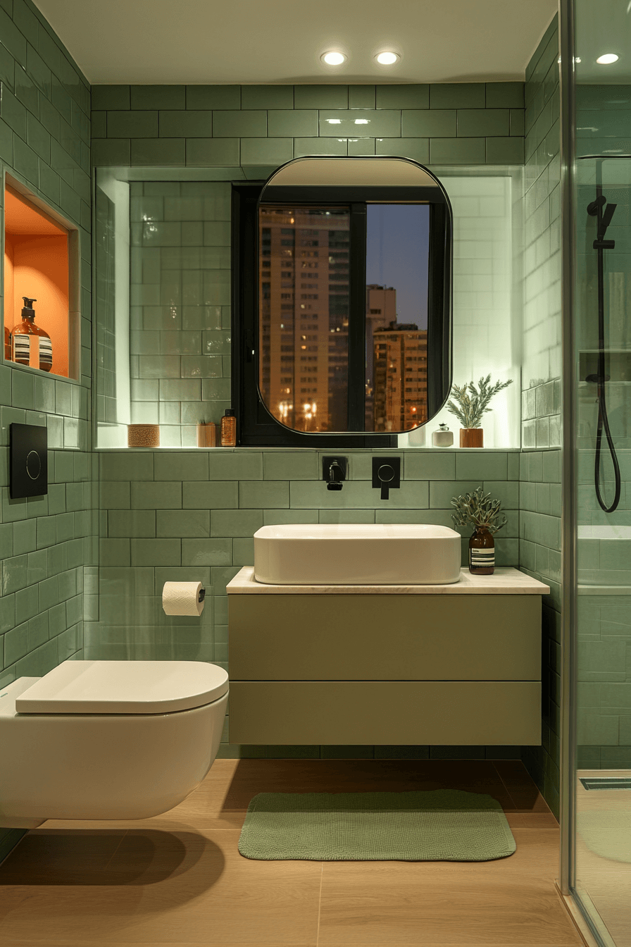 Small-scale sage tiles introduce warmth and charm without overwhelming compact spaces. These sage green bathroom ideas work especially well in guest or powder rooms. Soft grout and rounded fixtures maintain approachability. Plush towels add comfort. The look feels intimate yet refined.