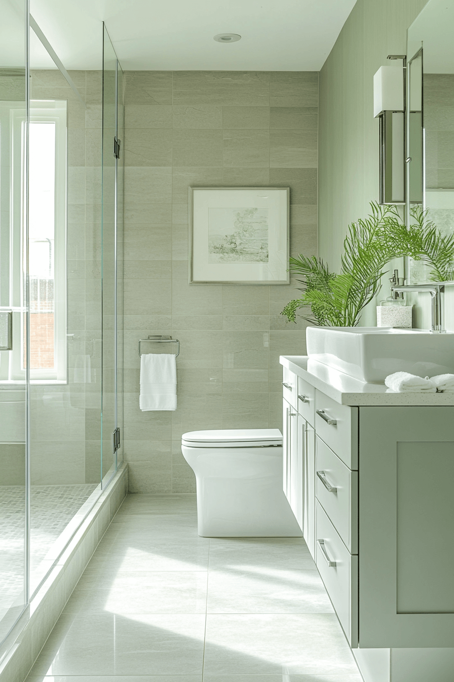 Cool sage tones paired with icy whites and light silvers create a crisp, refreshing bathroom palette. These sage green bathroom ideas feel airy and refined. Lightly veined stone countertops add subtle interest. Chrome and glass accents complete the look. The overall effect is clean and modern.