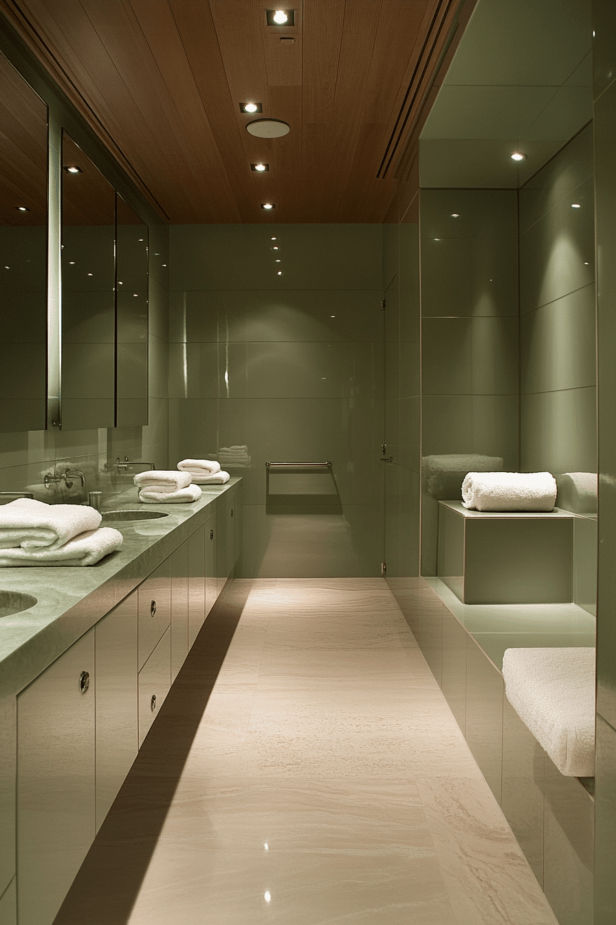 Transforming a bathroom into a personal retreat feels natural when sage green surfaces are paired with warm beige fixtures. The color immediately creates a sense of calm while maintaining a clean, refreshed feel throughout the space. Large mirrors and soft lighting enhance openness and relaxation. This approach stands out among soothing sage green bathroom ideas that feel indulgent yet practical. Light wood accents add warmth without visual heaviness.