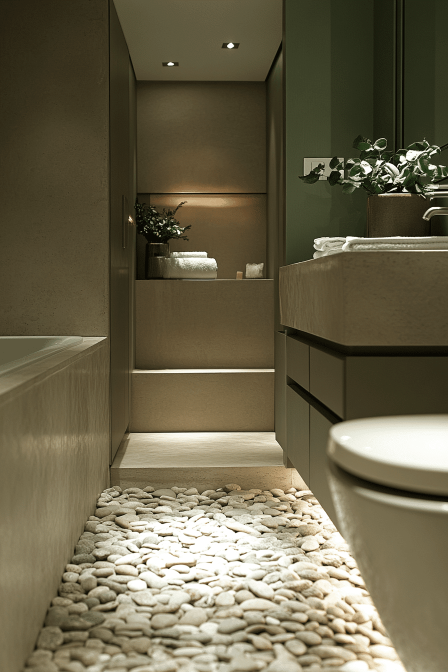 Pebble-textured flooring paired with smooth sage green walls creates a layered bathroom experience that feels natural and refined. These sage green bathroom ideas appeal to anyone drawn to tactile surfaces and spa-inspired comfort. The gentle texture underfoot enhances relaxation, especially in wet areas. Neutral surrounding finishes allow the materials to shine. The overall effect is luxurious yet approachable.