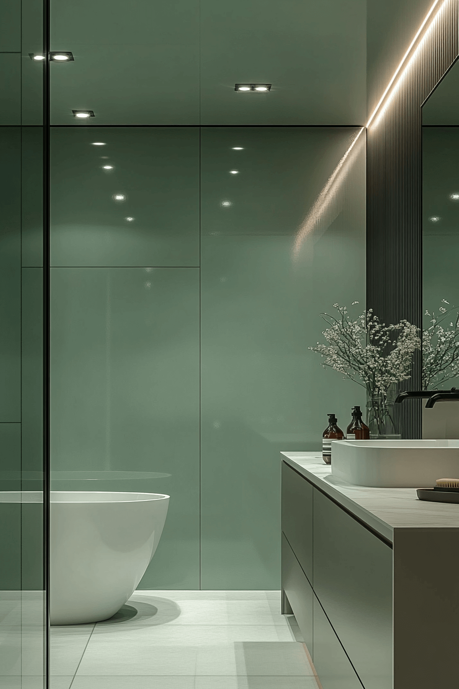 Gloss-finished sage cabinetry introduces reflective elegance without overpowering warmth. These sage green bathroom ideas are well suited for spaces needing added light and depth. Pale countertops balance the shine for visual harmony. Thoughtful lighting highlights corners and surfaces. Frameless mirrors enhance the modern feel.