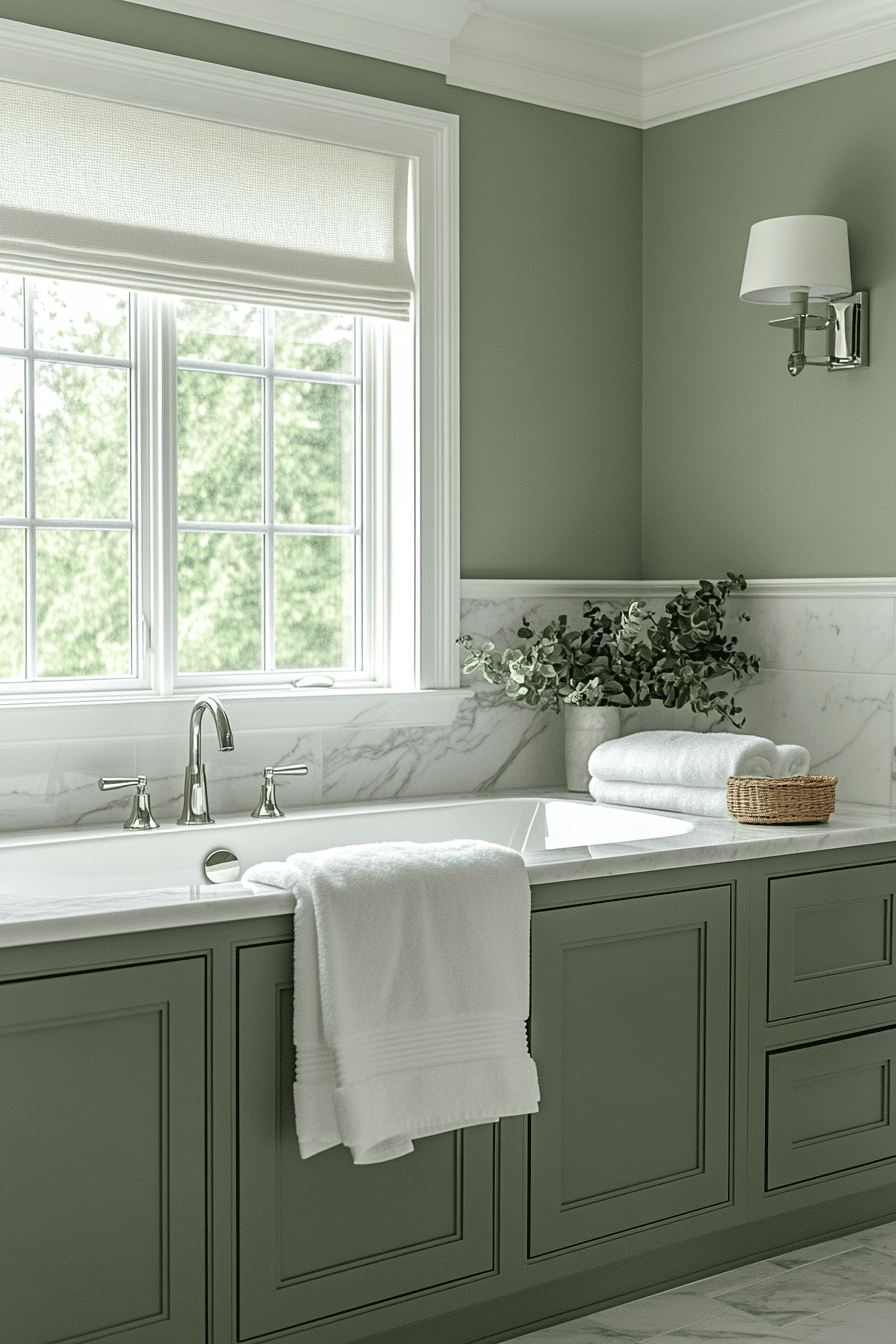 Soft sage green walls blend effortlessly with light marble accents to form a bathroom that feels calm, refined, and thoughtfully composed. The marriage of natural stone and muted green delivers a spa-inspired atmosphere without tipping into cold minimalism. Subtle marble veining adds visual interest while sage tones soften the overall palette. This balance makes it a strong choice for elevated sage green bathroom ideas that remain welcoming. Gentle lighting and streamlined hardware complete the look with quiet sophistication.