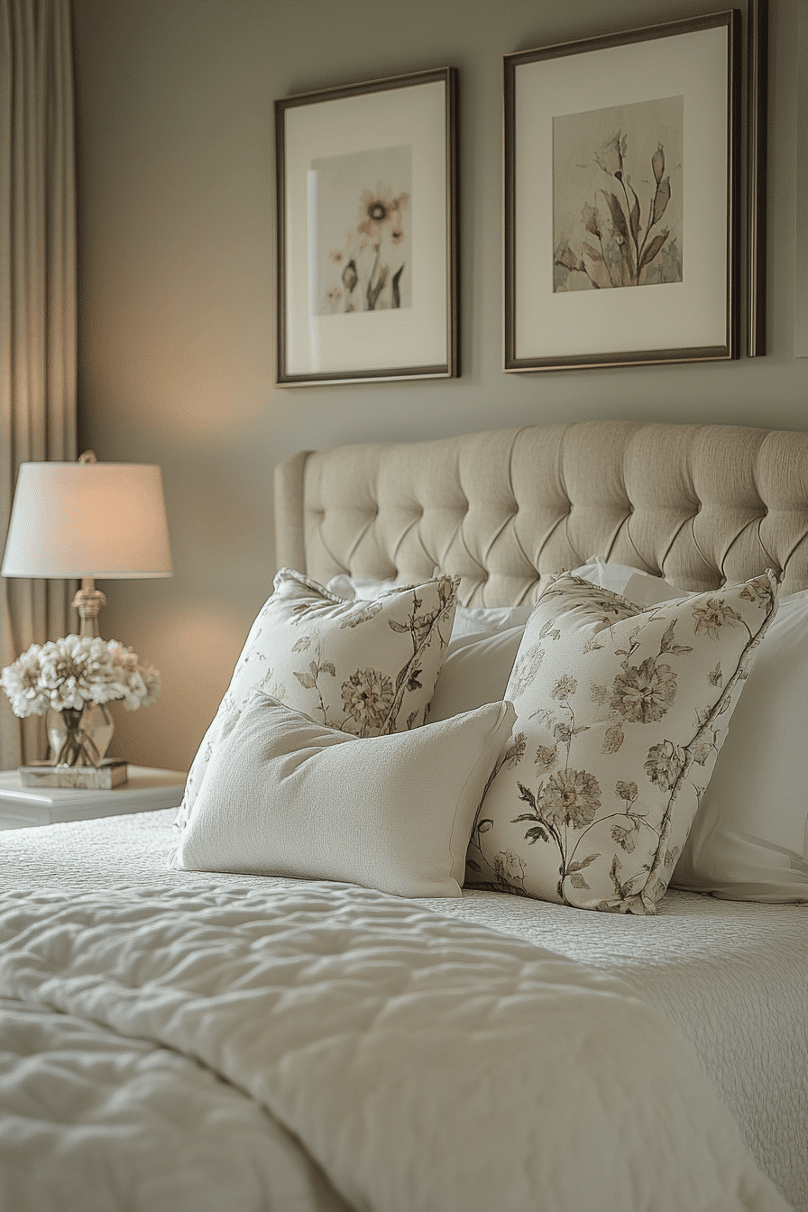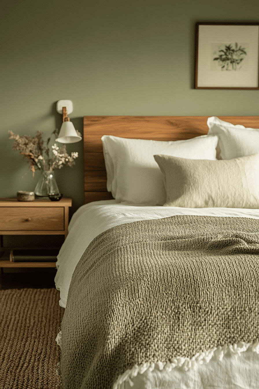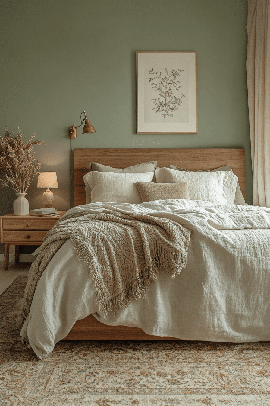A warm and inviting atmosphere comes to life in a sage green bedroom designed for comfort and calm. Soft bedding in neutral tones pairs beautifully with the gentle green walls. Warm ambient lighting enhances the peaceful mood of the space. Layered textiles like throws and cushions bring extra coziness without clutter. The result is a bedroom that feels soothing and welcoming. Explore more cozy sage bedroom inspiration.