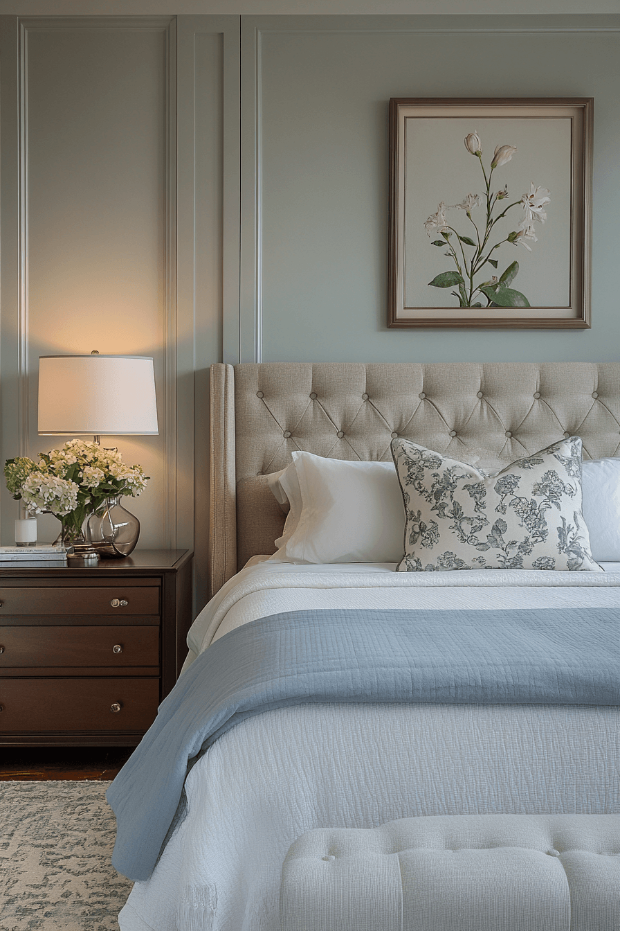 Light accents help a sage green bedroom feel bright and airy. White décor highlights the softness of the green tones. Reflective finishes enhance the sense of openness. Neutral bedding ties the design together beautifully. The room feels calm and spacious. See more light sage bedroom inspiration.