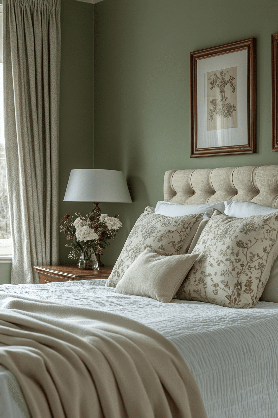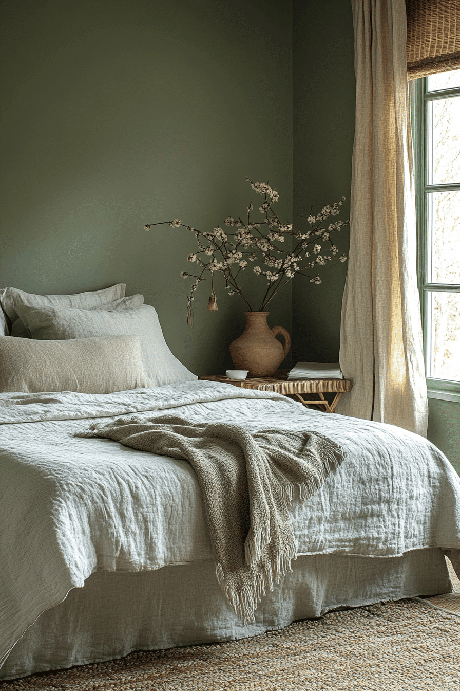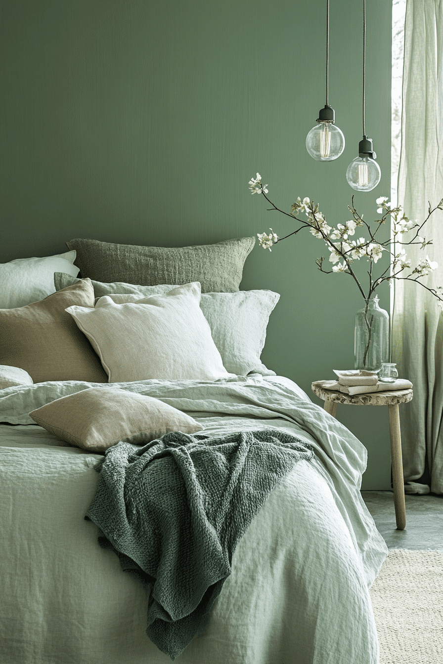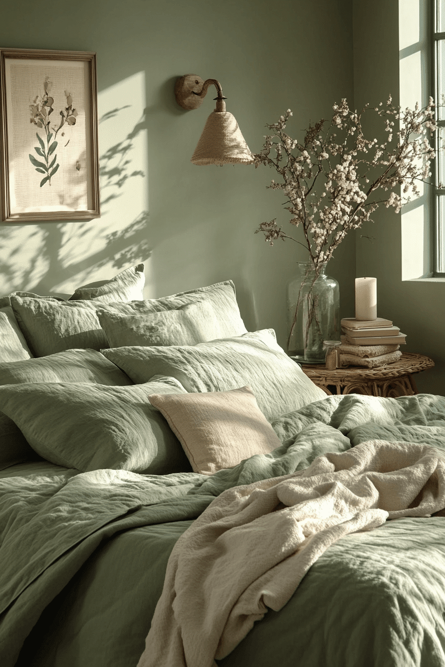 Dreamy calm fills a sage green bedroom styled with soothing textures and gentle tones. The green walls create a tranquil atmosphere. Neutral furniture highlights the palette beautifully. Plush bedding adds warmth and depth. The design feels serene and elegant. Explore more dreamy sage bedroom inspiration.