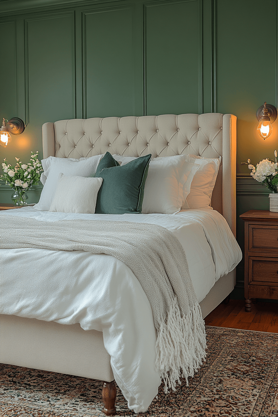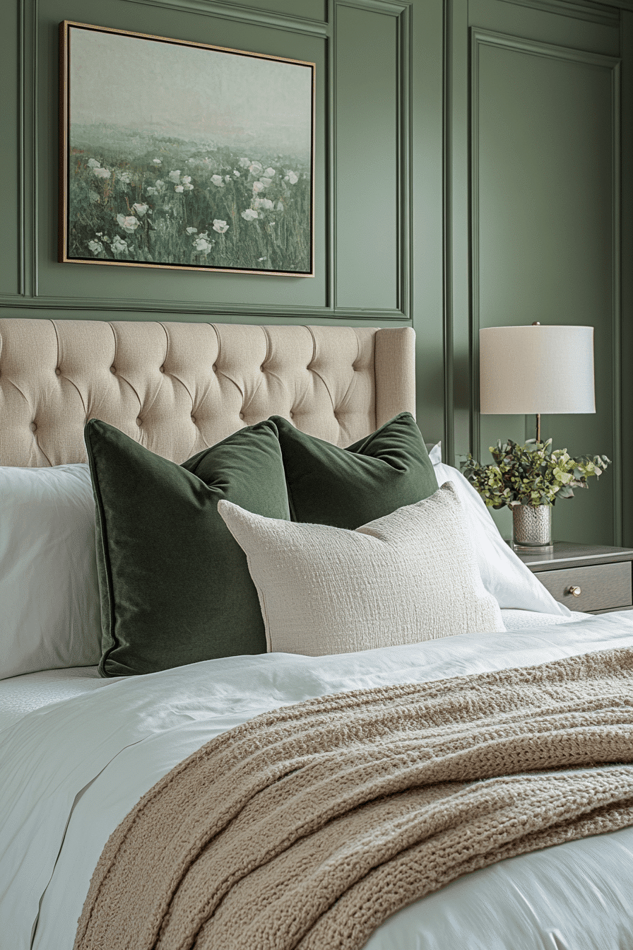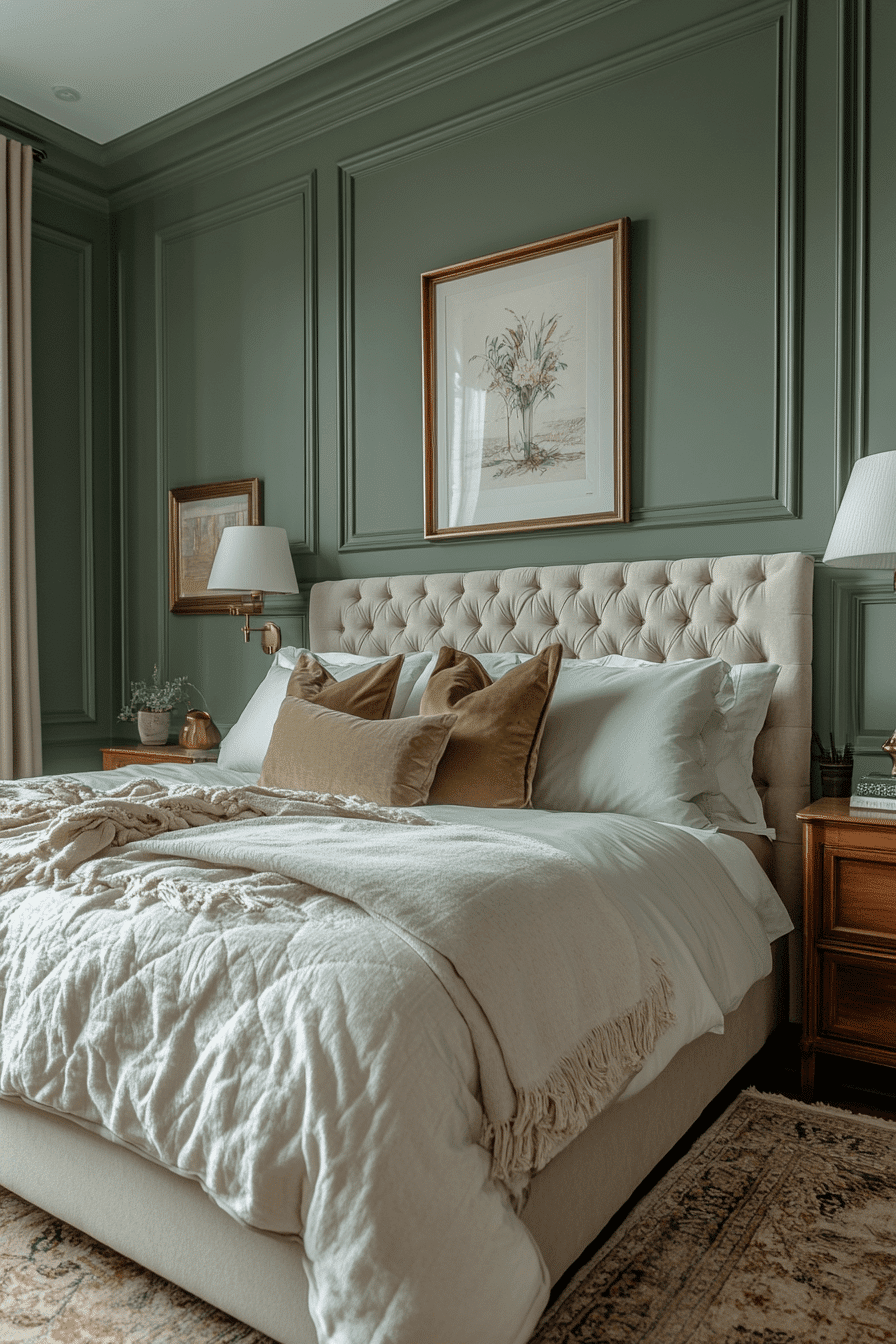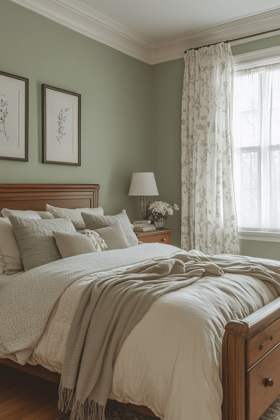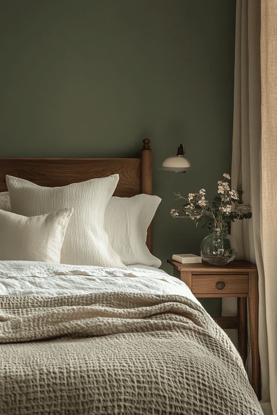 Dreamy calm fills a sage green bedroom styled with soothing textures and gentle tones. The green walls create a tranquil atmosphere. Neutral furniture highlights the palette beautifully. Plush bedding adds warmth and depth. The design feels serene and elegant. Explore more dreamy sage bedroom inspiration.
