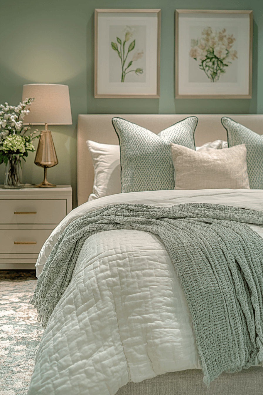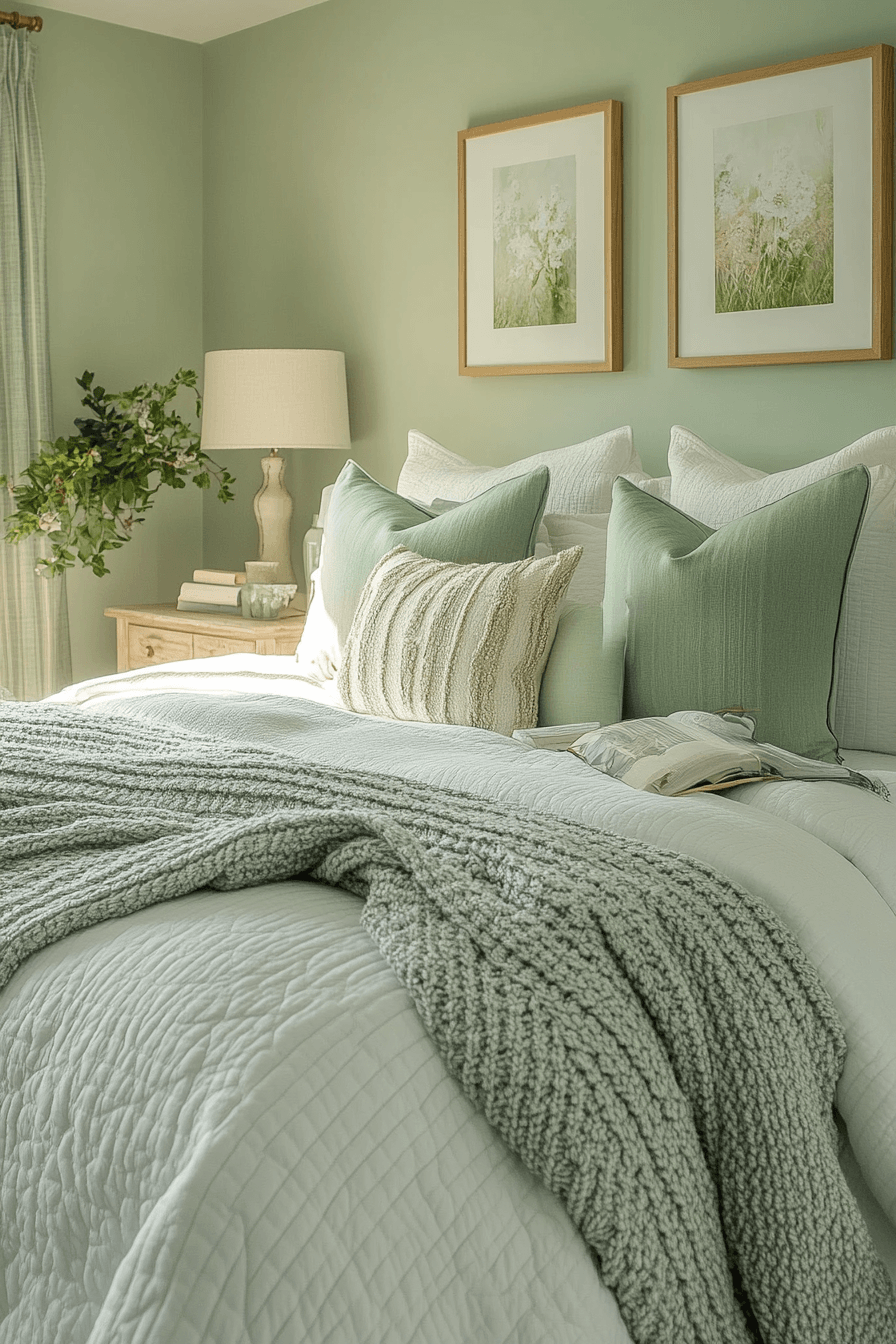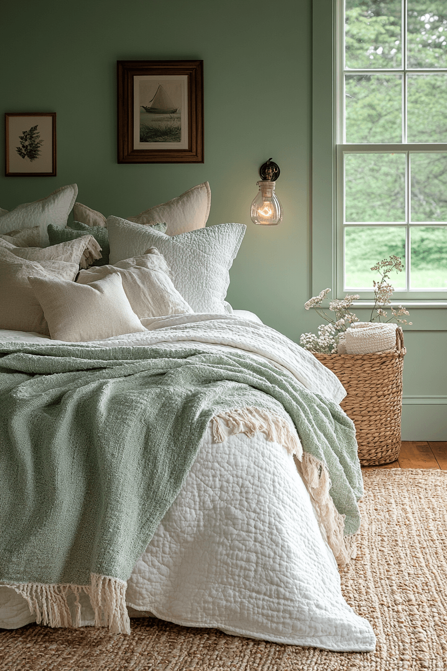 Warm fabrics add comfort and charm to a sage green bedroom designed for relaxation. Plush pillows and cozy throws soften the palette. Simple furniture maintains a tidy and open layout. Neutral décor keeps the design balanced. The room feels welcoming and peaceful. Discover more cozy sage bedroom inspiration.