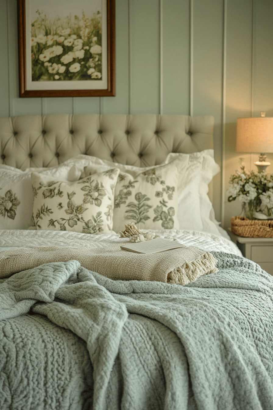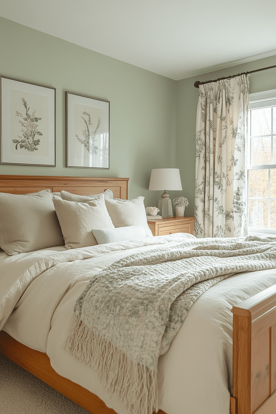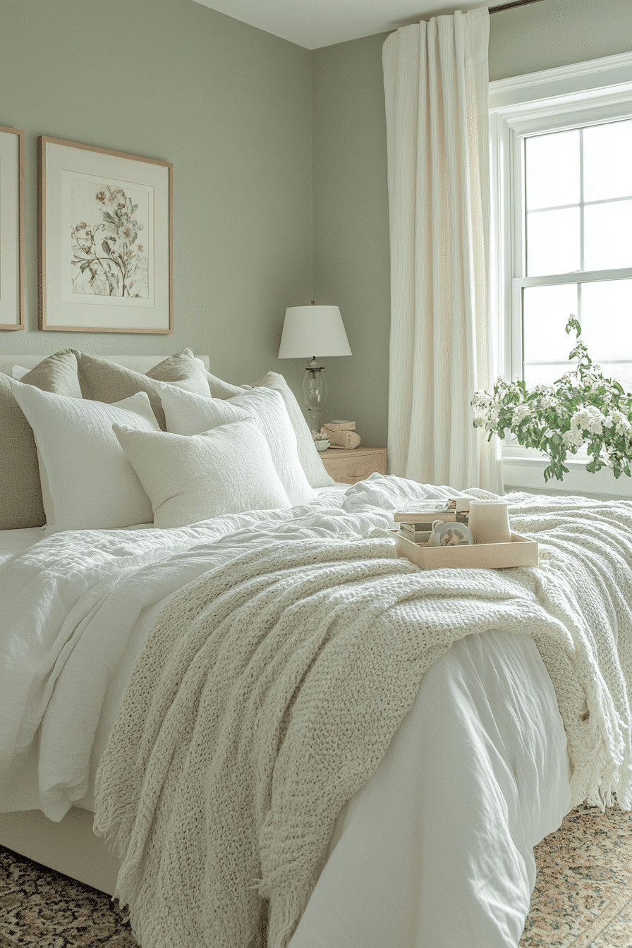 Warm fabrics add comfort and charm to a sage green bedroom designed for relaxation. Plush pillows and cozy throws soften the palette. Simple furniture maintains a tidy and open layout. Neutral décor keeps the design balanced. The room feels welcoming and peaceful. Discover more cozy sage bedroom inspiration.