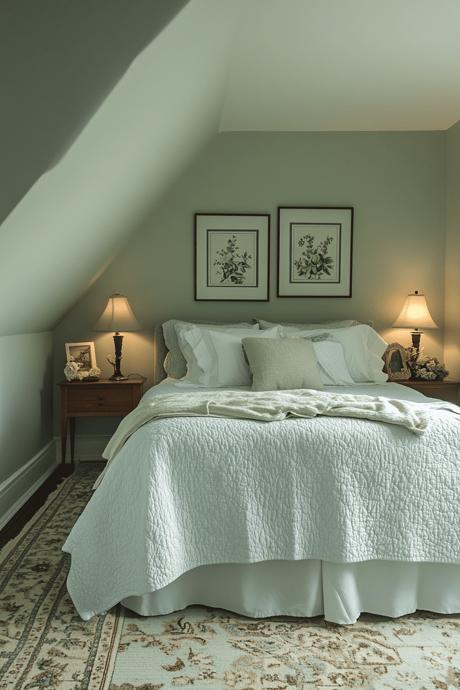 Sophisticated styling elevates a sage green bedroom into a graceful space. Slim furniture adds elegance without overwhelming the layout. Neutral bedding complements the soft green tones beautifully. Lighting highlights the calming palette. The room feels refined and inviting. Explore more elegant sage bedroom inspiration.
