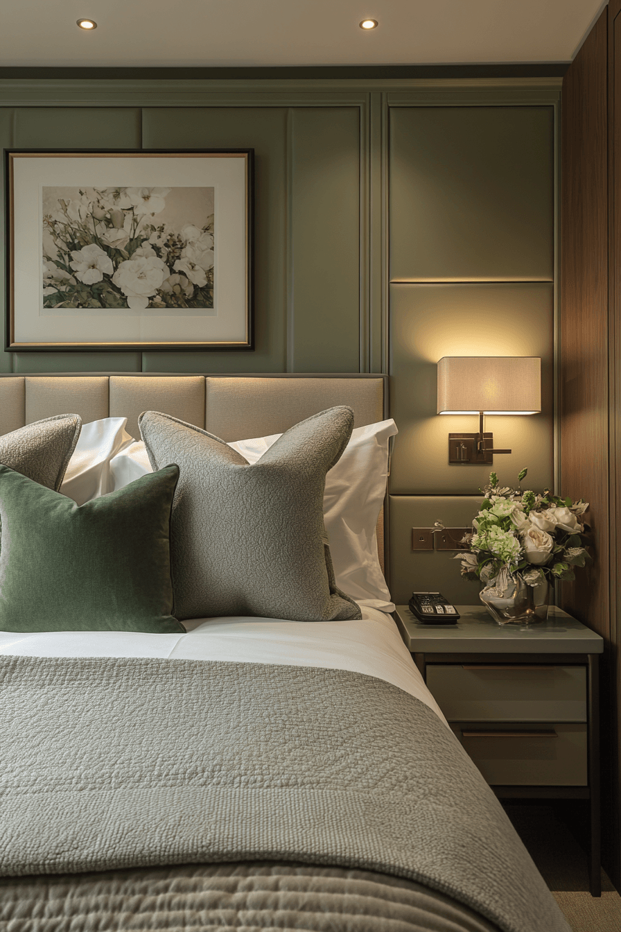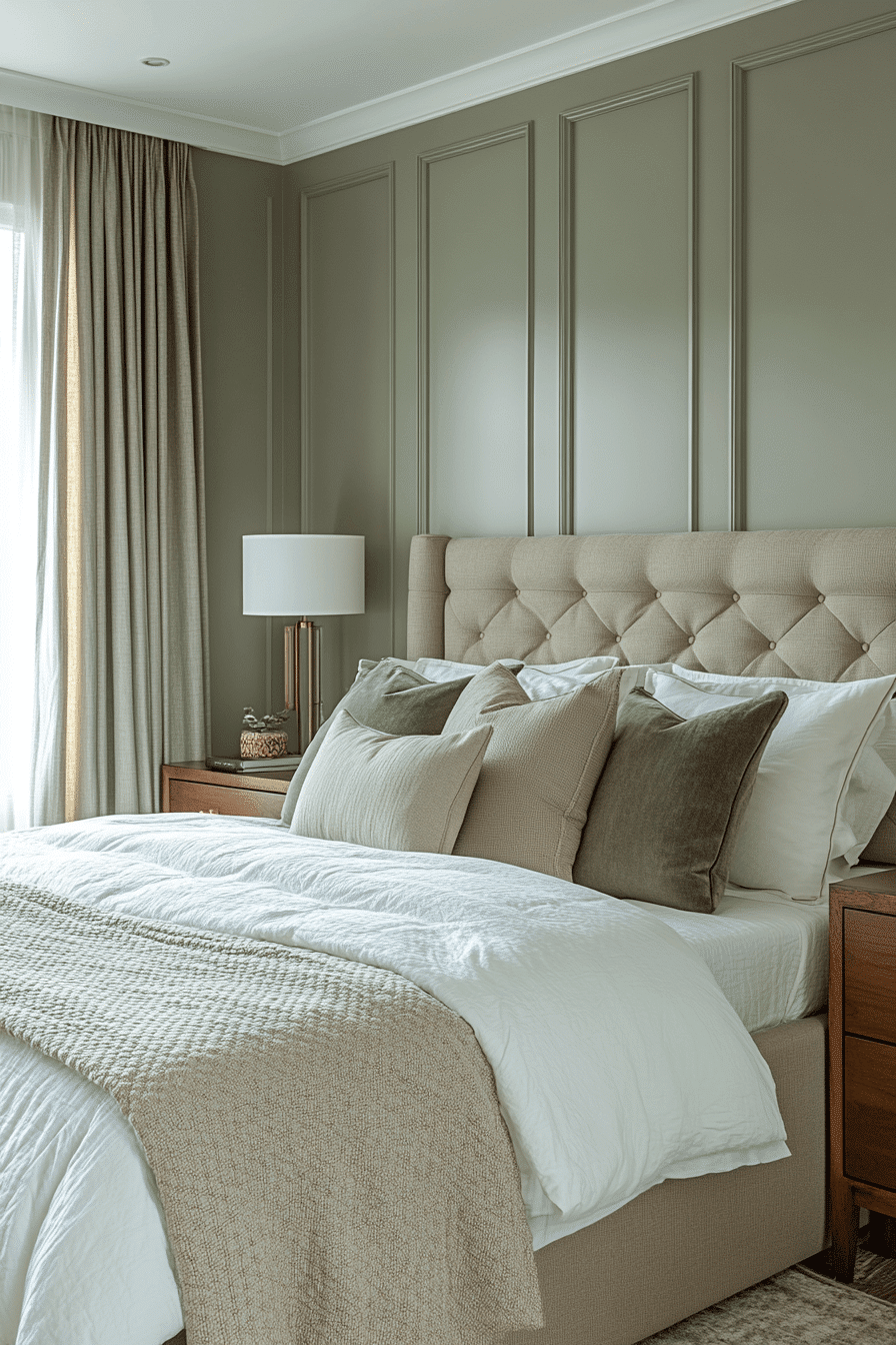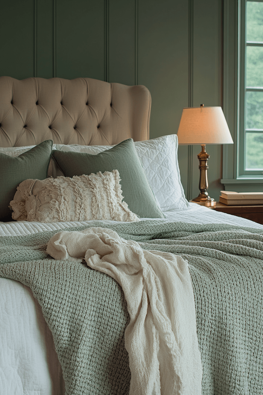Layered textures can bring subtle luxury to a sage green bedroom. Soft bedding and plush fabrics enhance the cozy atmosphere. Sage walls create a calming backdrop for elegant details. Warm lighting highlights the textures beautifully. The space feels refined and relaxing. Discover more luxe sage bedroom inspiration.