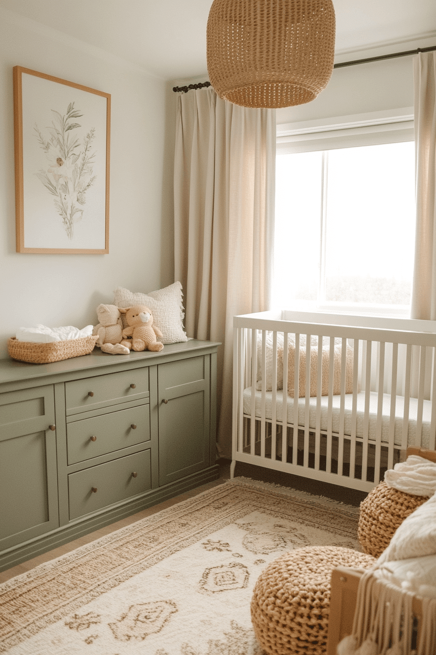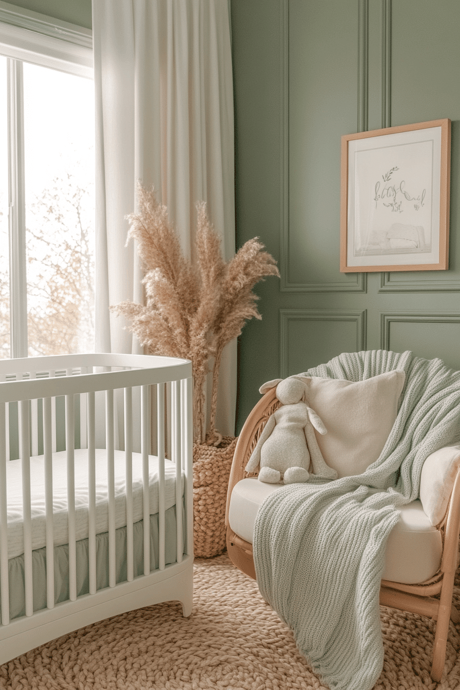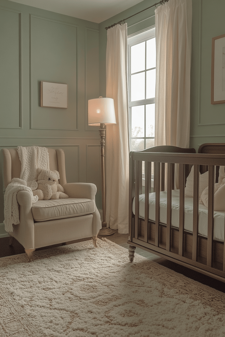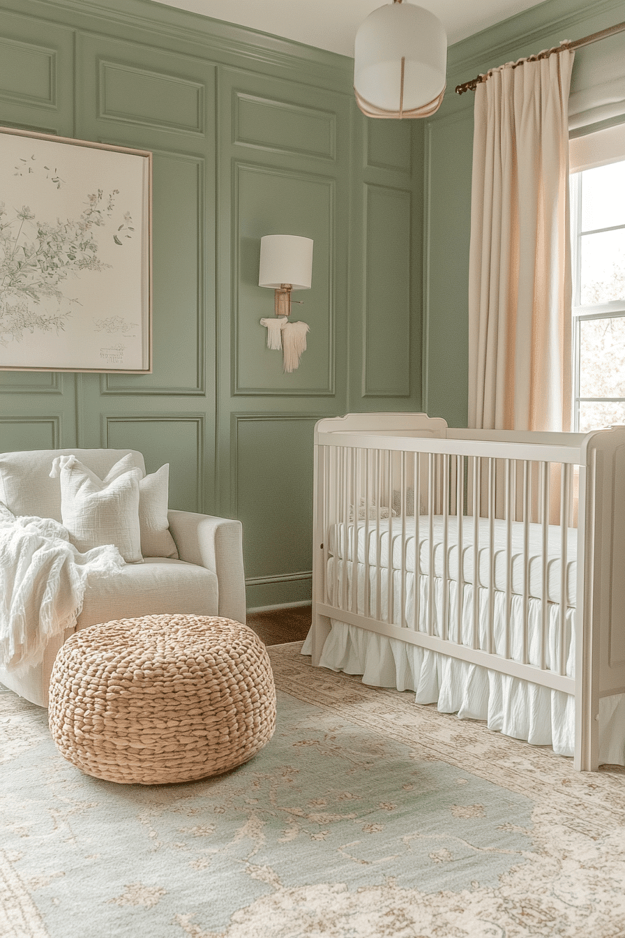 A gentle mix of cream, sand, and sage green creates a warm and loving nursery environment. Each element contributes to emotional comfort and softness. The sage walls play a quiet but essential role in the palette. Golden lighting enhances the welcoming atmosphere. Textured rugs and subtle decor complete the look.
