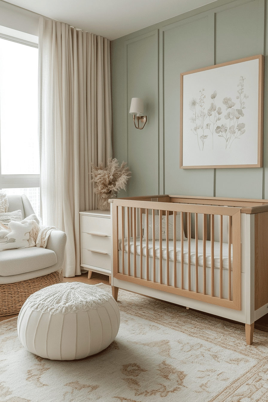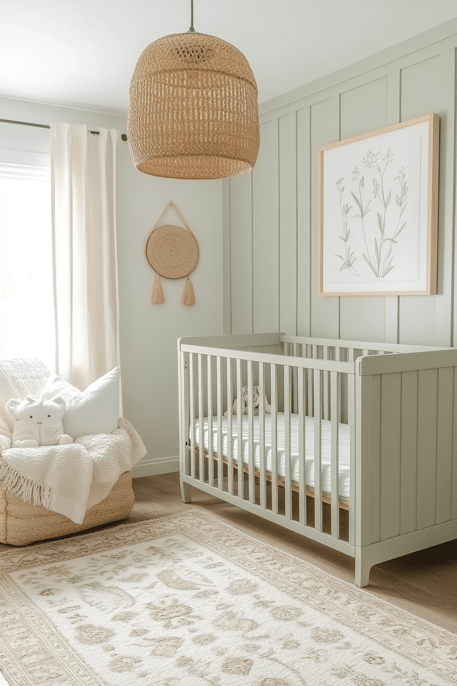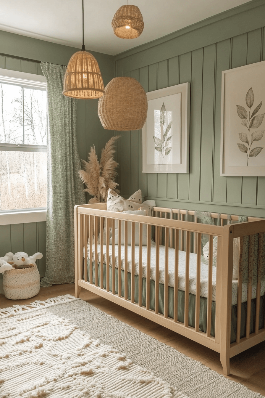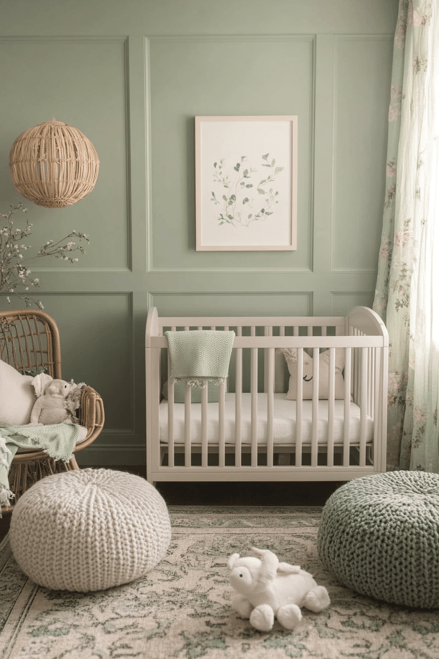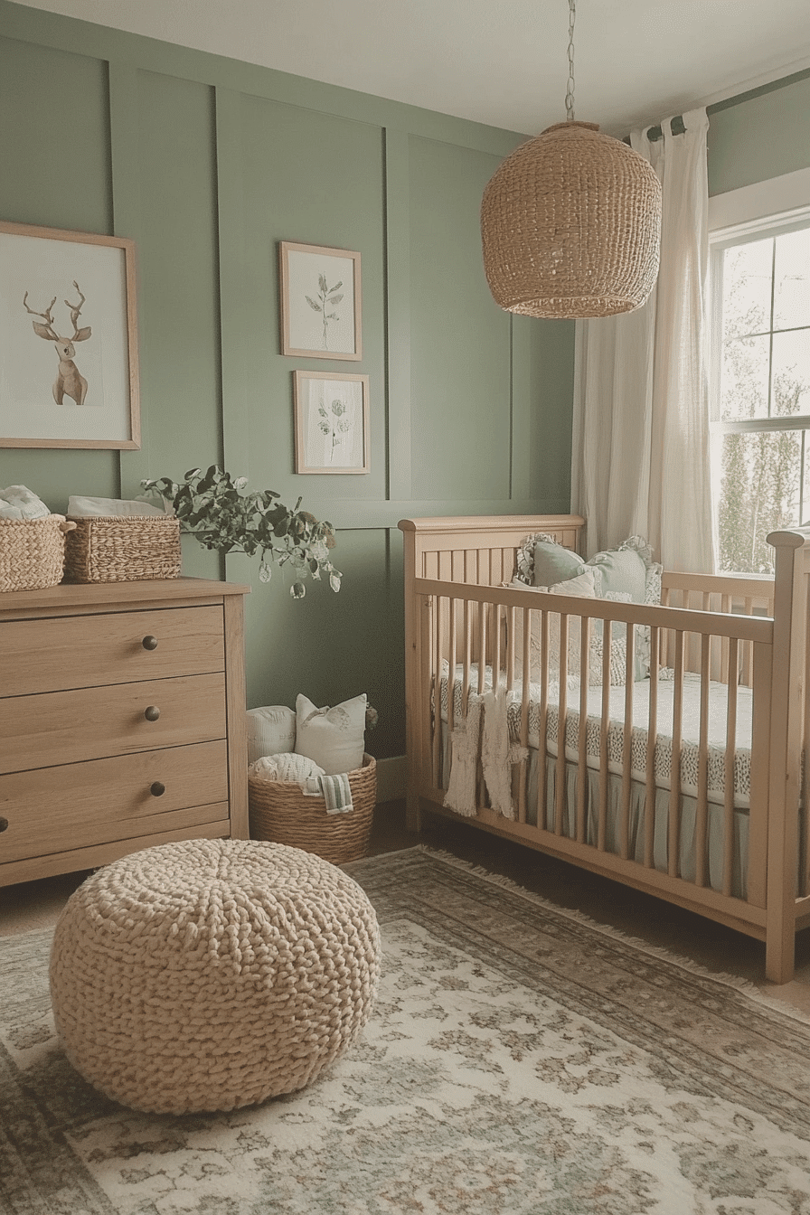 A gentle mix of cream, sand, and sage green creates a warm and loving nursery environment. Each element contributes to emotional comfort and softness. The sage walls play a quiet but essential role in the palette. Golden lighting enhances the welcoming atmosphere. Textured rugs and subtle decor complete the look.