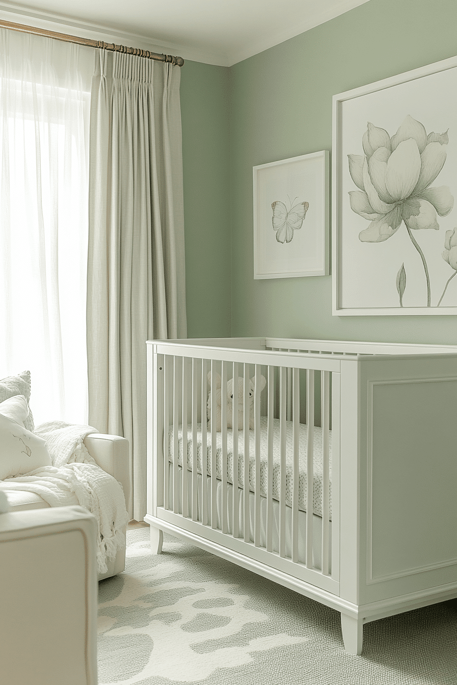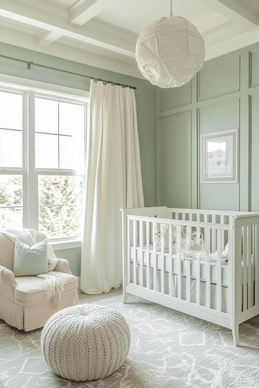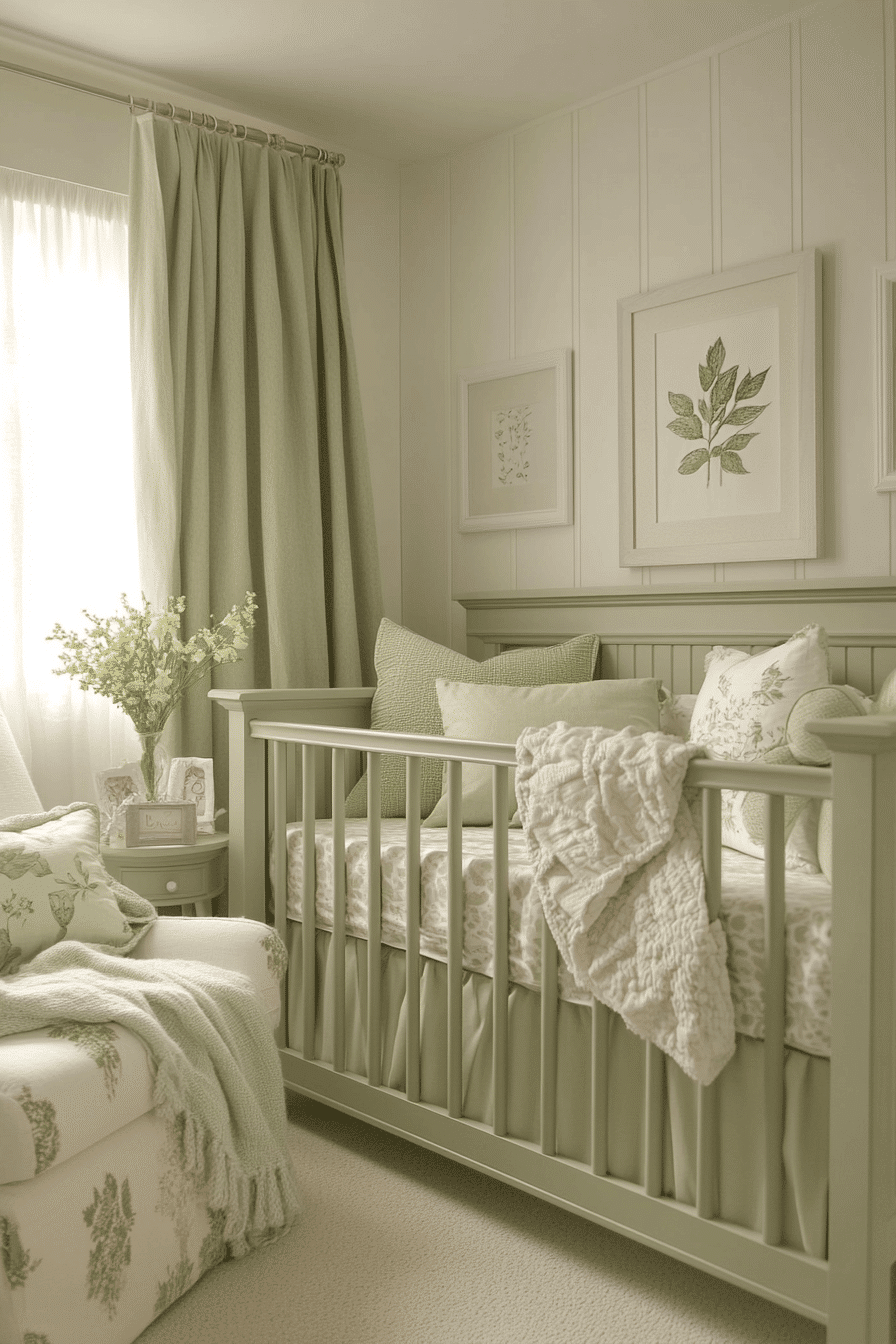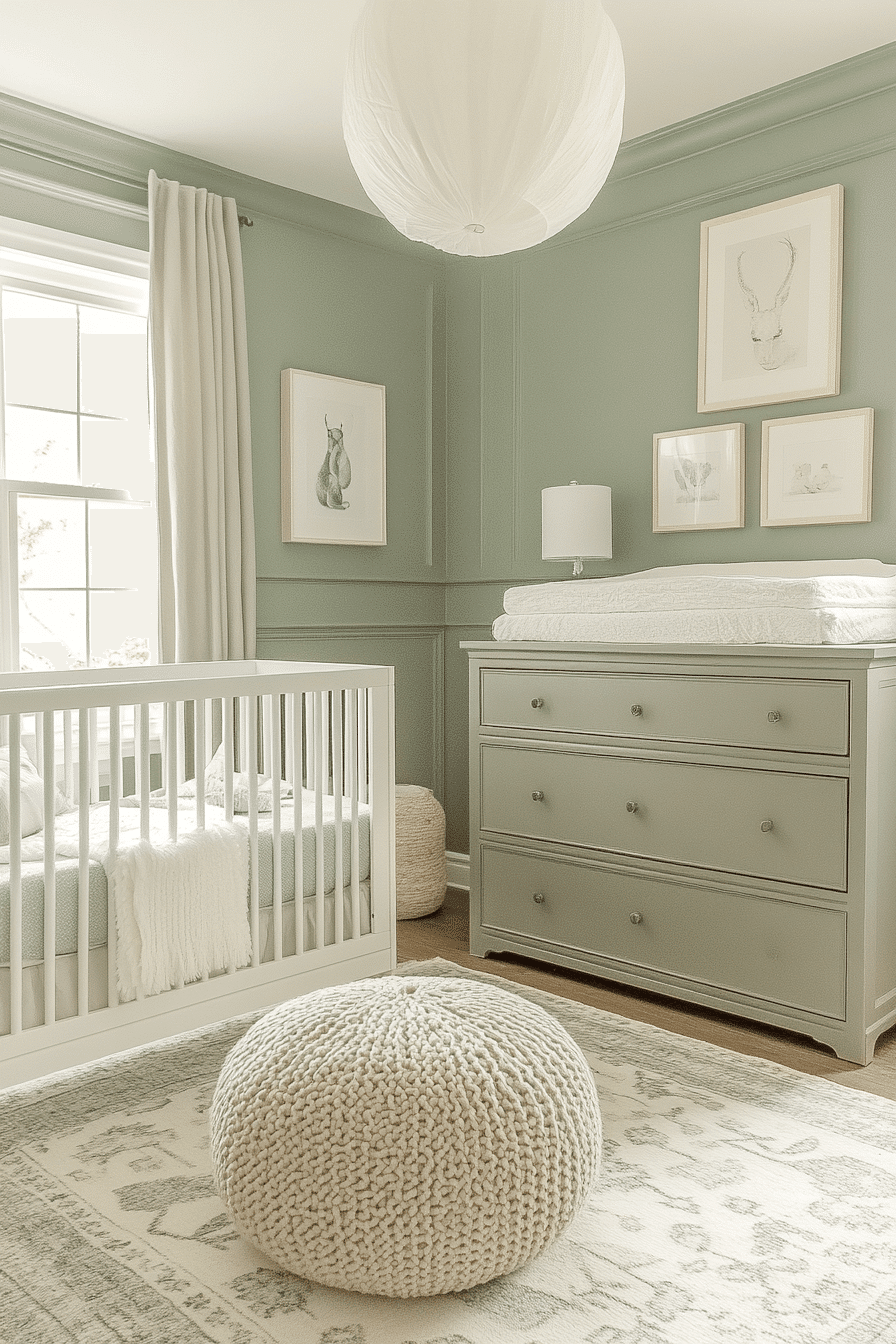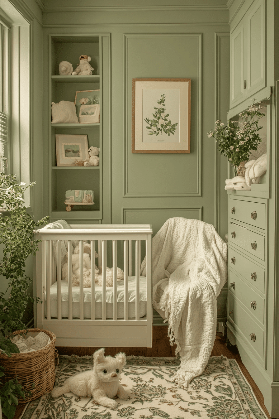 In this sage green nursery, the design feels light and breathable from corner to corner. Soft textiles and open shelving create an uncluttered sense of space. The sage hue keeps the room grounded without heaviness. Pale gray and white accents add calm simplicity. Airy curtains enhance the fresh atmosphere.