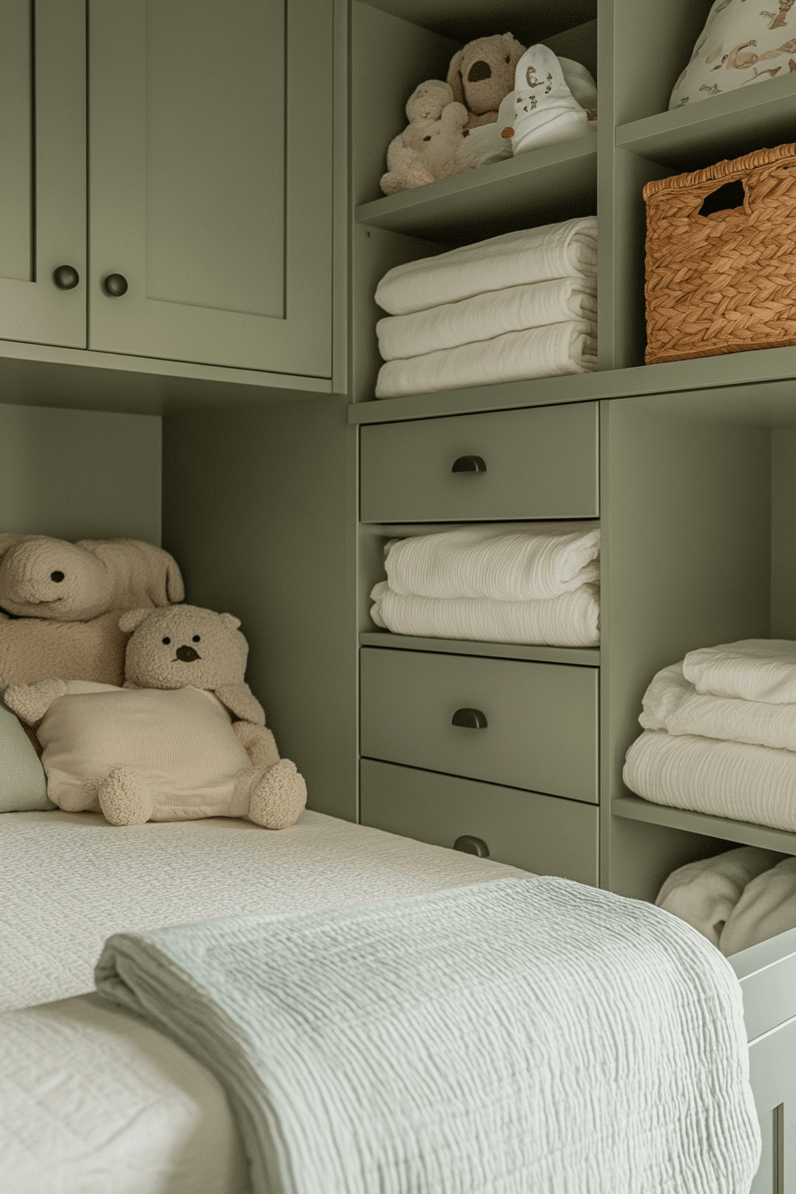 This sage green nursery feels crisp and calm thanks to white trim, organized storage, and bright lighting. Clean lines bring clarity without coldness. Soft sage paint balances structure with serenity. Everything feels tidy, functional, and fresh. The space supports calm routines for both baby and parent.