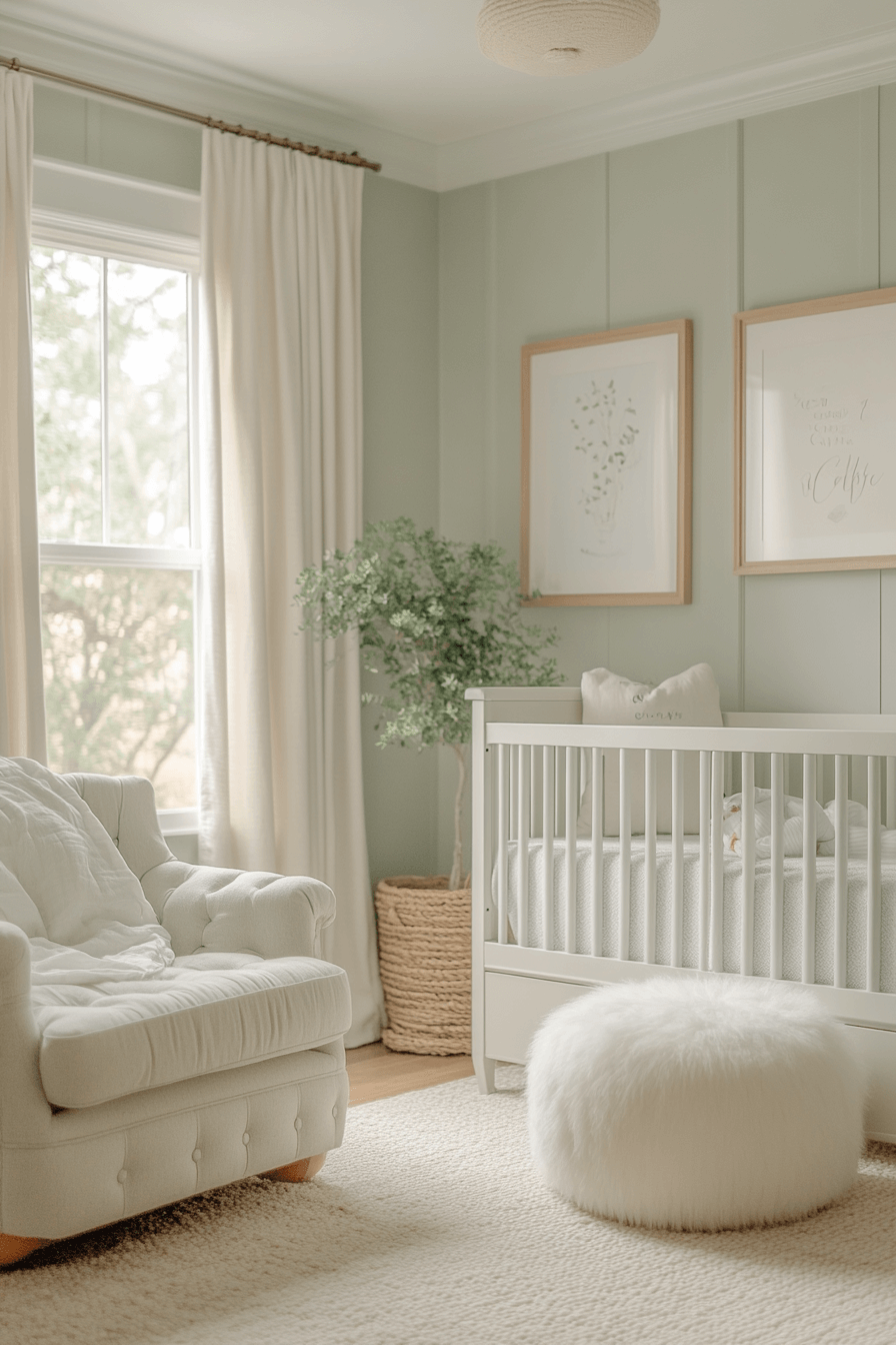 This sage green nursery is designed to feel as soothing as a cloudy sky. Clean lines and soft edges in the furniture create a calming environment for both baby and parent. A sage accent wall anchors the room while white elements keep it open and light. Curved lighting fixtures and fluffy textiles add extra comfort. The palette works beautifully as a gender-neutral choice.