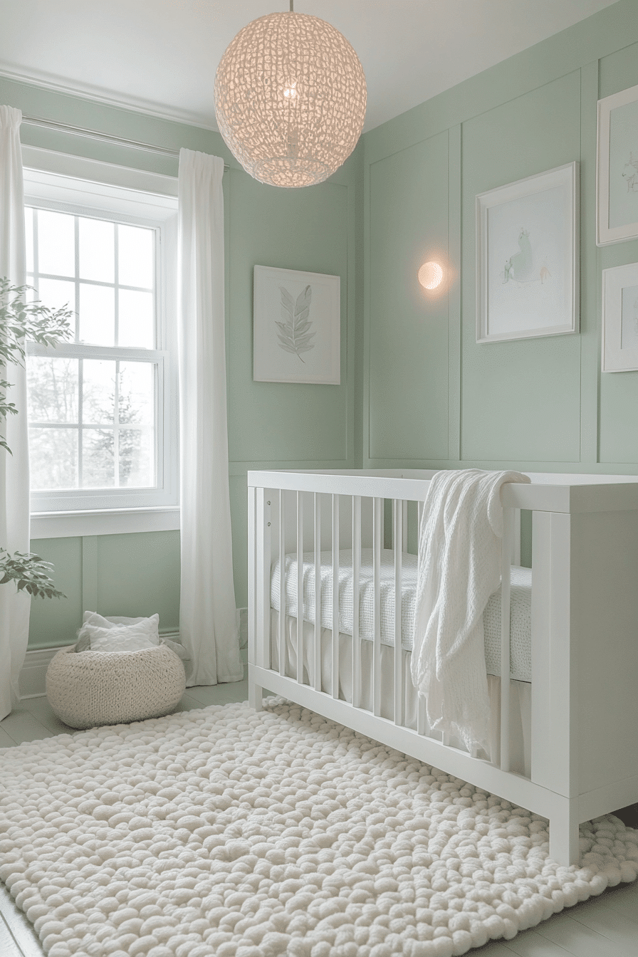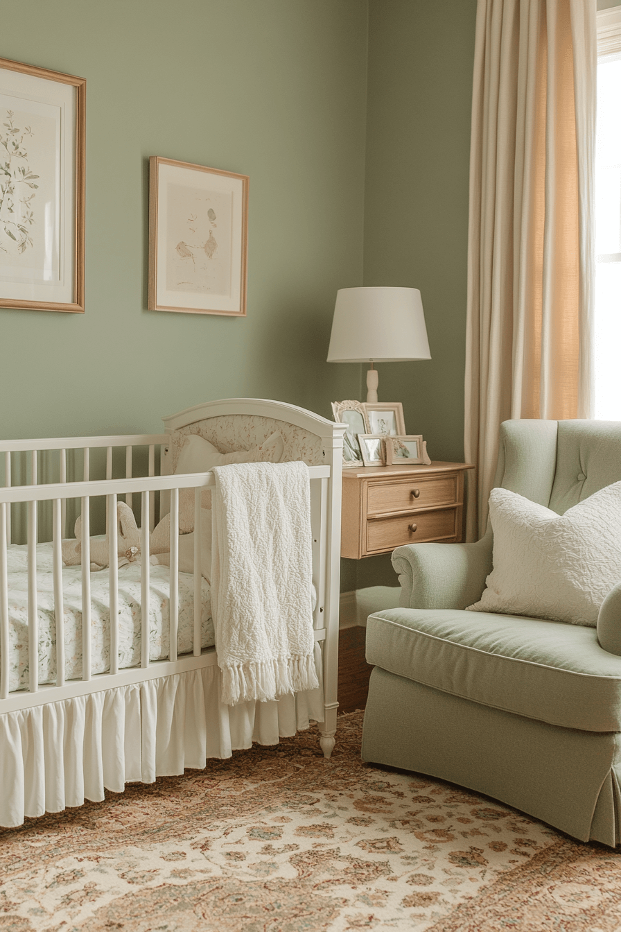 A calming escape takes shape in this sage green nursery through smooth textures and balanced lighting. The color wraps the space in quiet elegance. A rocking chair, pale rug, and clean-lined crib reinforce the restful mood. Minimal accessories allow the green hue to shine naturally. The room encourages deep rest and gentle routines.