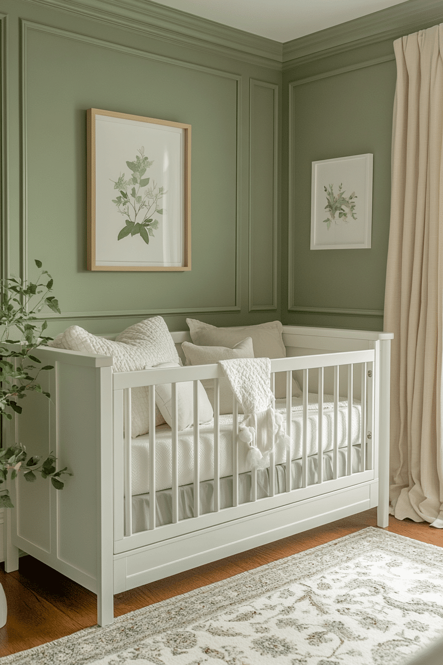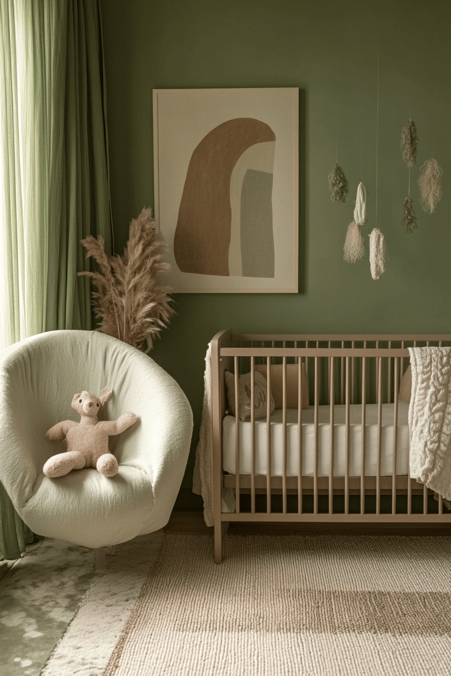 This sage green nursery introduces elegance through silky textures and smooth finishes. A velvety chair and soft drapes add quiet luxury. Matte sage walls reflect light softly throughout the room. White furniture keeps the look fresh and balanced. The design feels refined without excess.