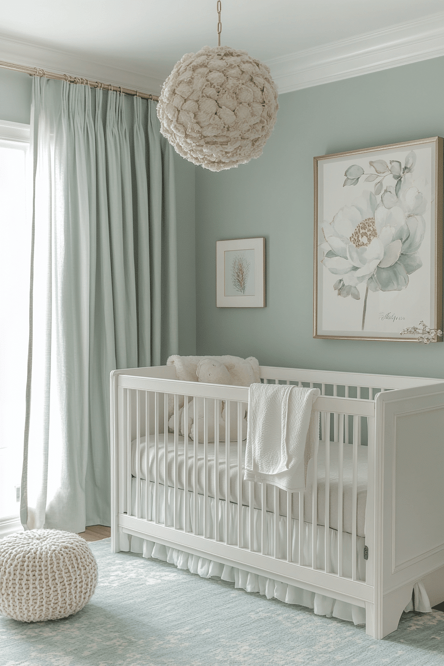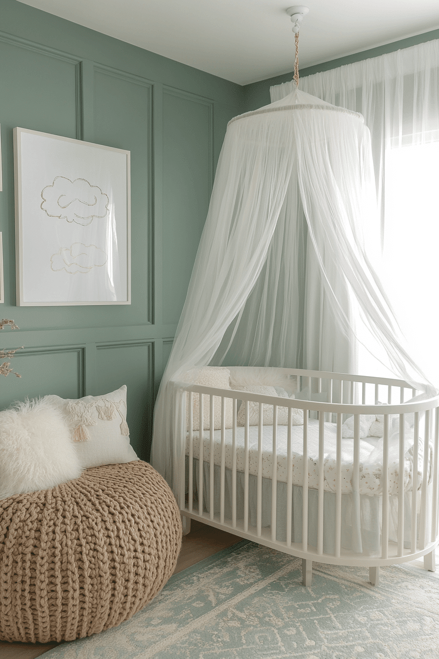 This sage green nursery captures a delicate sense of imagination with its soft tones and whimsical details. Gentle wall colors are complemented by rounded furniture and plush textiles that feel comforting and calm. A cloud-shaped mobile and light-colored crib keep the look airy and playful. The sage hue adds serenity while still allowing room for creative styling. Soft whites and grays balance the palette for a peaceful visual experience.