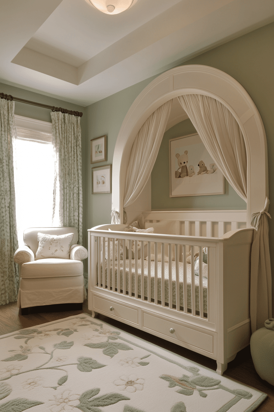 Wrapped in neutral tones and soft sage walls, this nursery feels like a cocoon for new beginnings. Plush fabrics and soft lighting create comfort for every sense. The sage green blends seamlessly with ivory, taupe, and beige elements. Rounded corners and layered textures enhance the nurturing feel. Nothing distracts from the sense of ease.