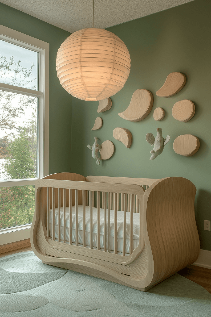 With sage green as its base, this nursery echoes softness in every detail. Curtains, linens, and pillows layer gently for visual calm. Curved shapes and diffused lighting enhance the restful mood. The palette remains cohesive and soothing. The room feels like a gentle repetition of comfort.