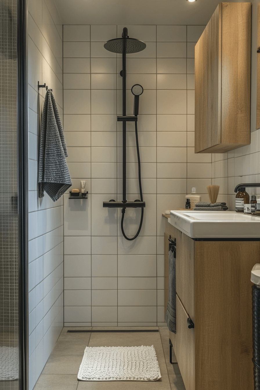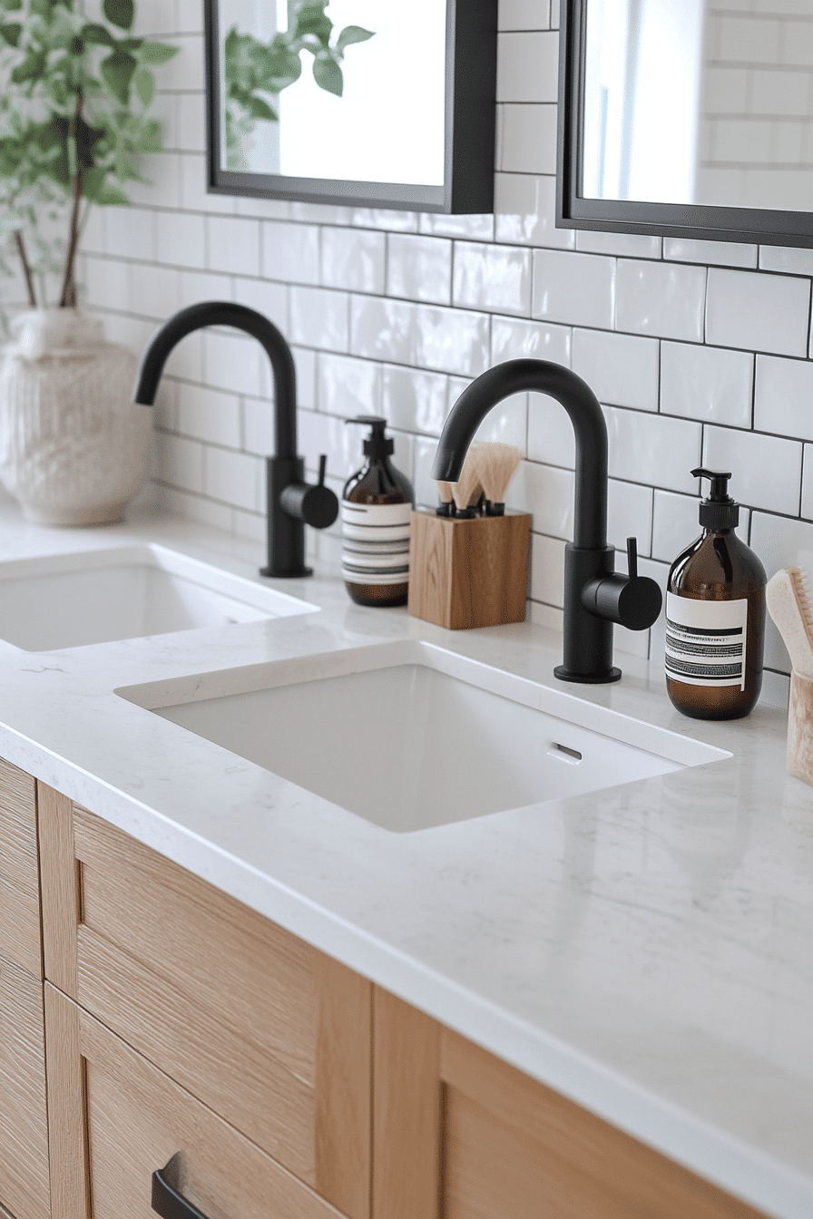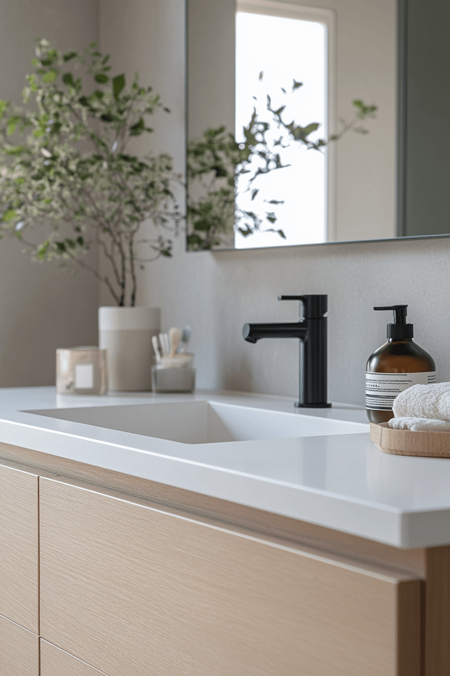 Using bold fixtures sparingly creates impact in a scandi bathroom while maintaining balance and simplicity throughout the design. Dark elements define the space without overpowering it. The contrast enhances clean lines and structure. The overall look remains refined and cohesive. This detail adds personality without clutter. Get inspired by fixture choices that elevate minimalist bathrooms.