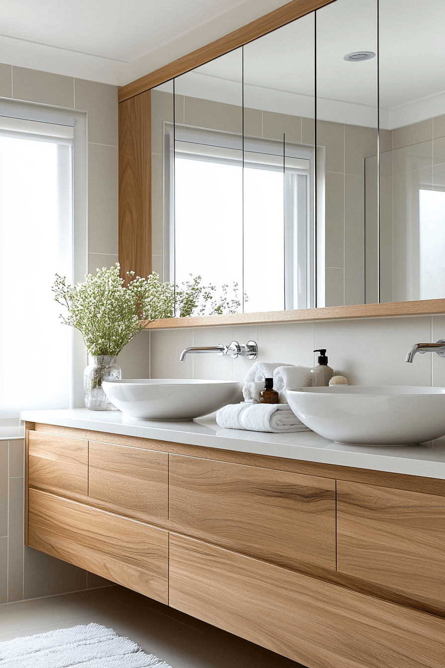 Bringing natural timber elements into a scandi bathroom creates a warm and inviting atmosphere that softens the crispness of white and neutral surfaces. Light wood cabinetry and subtle grain details add depth without disrupting the minimalist aesthetic. This organic touch introduces comfort while keeping the design clean and cohesive. Paired with matte finishes, the overall look feels balanced and harmonious. The connection to nature becomes a defining feature of the space. Explore more timber-inspired bathroom designs that feel calm and grounded.