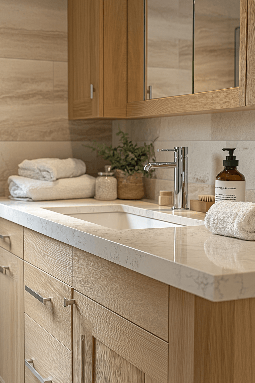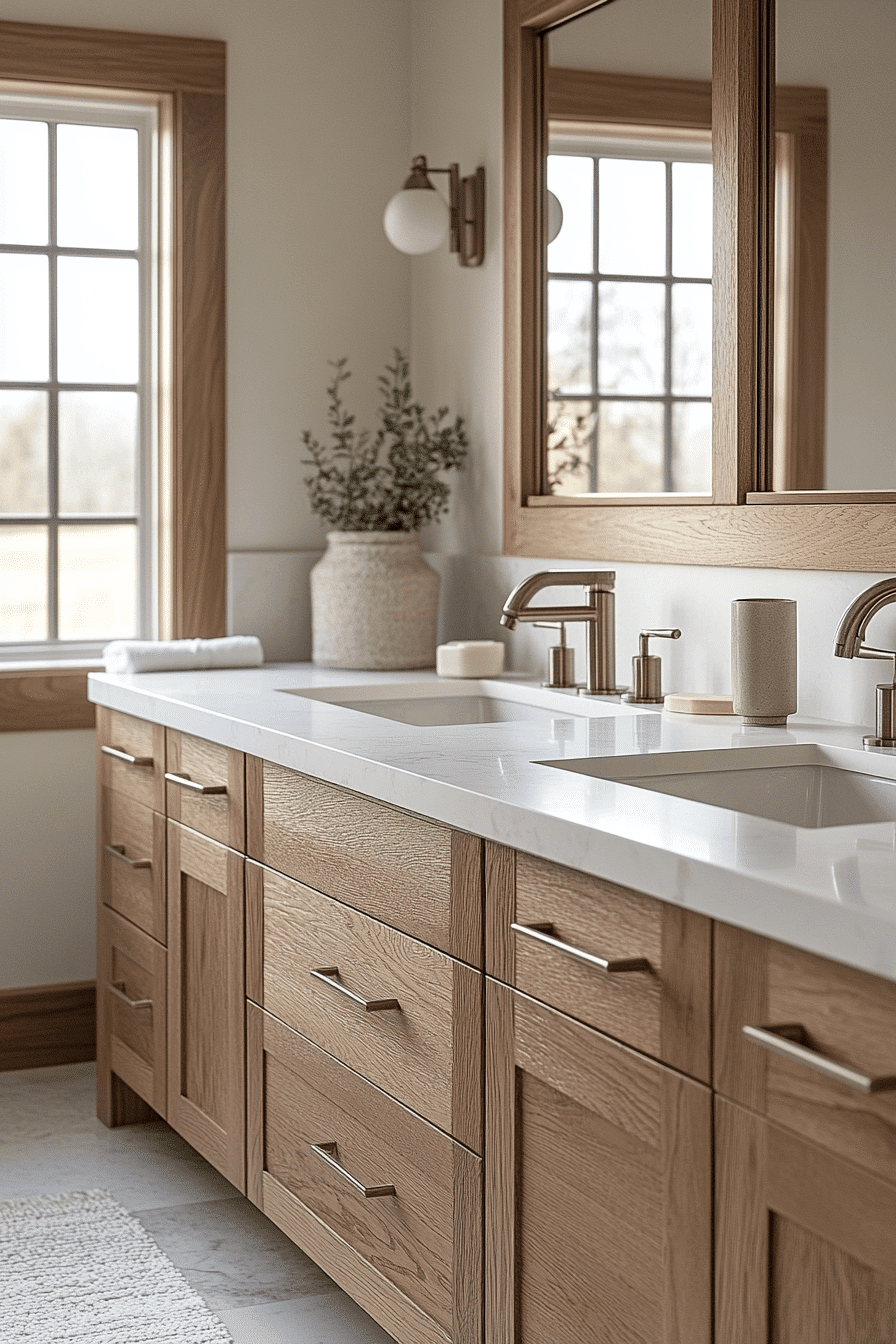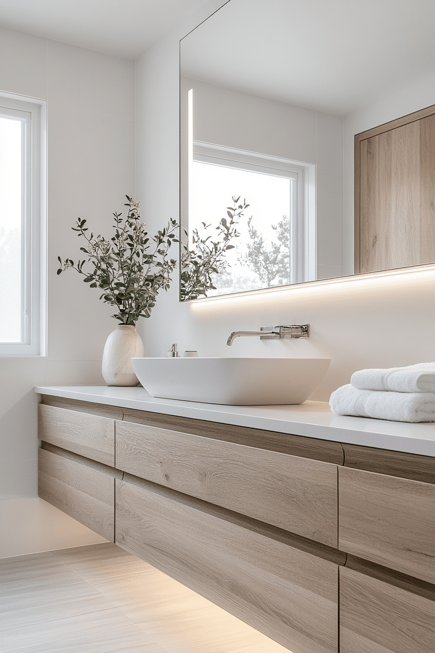 Suspending cabinetry above the floor gives a scandi bathroom a lighter, more open feel while maintaining a sleek and modern appearance. The floating effect creates visual space and enhances the overall flow of the room. Clean lines and neutral finishes ensure the design remains cohesive. Practical benefits like easier cleaning make this choice functional as well. The result is both stylish and efficient. Take a look at elevated vanity ideas that modernize your bathroom.
