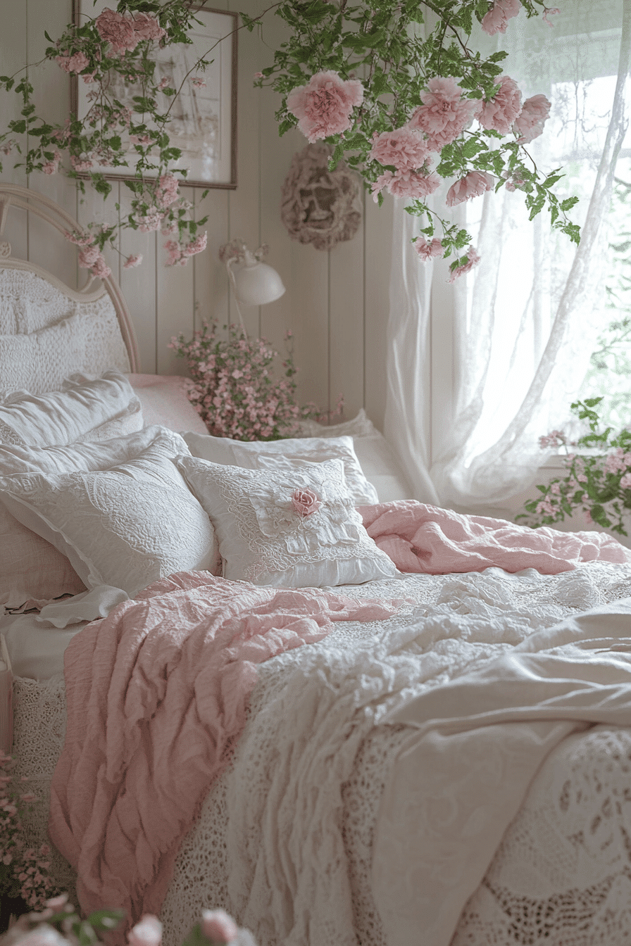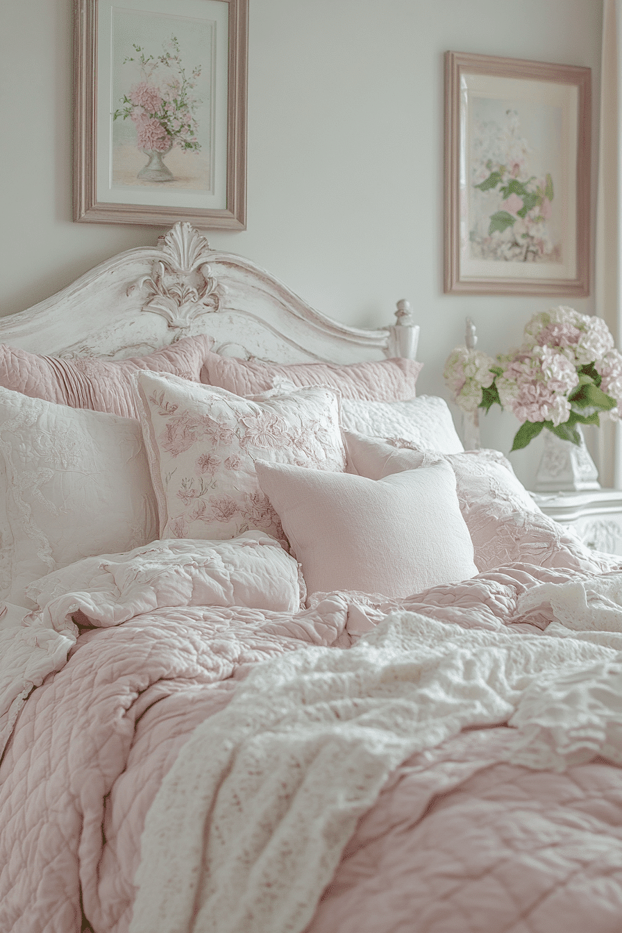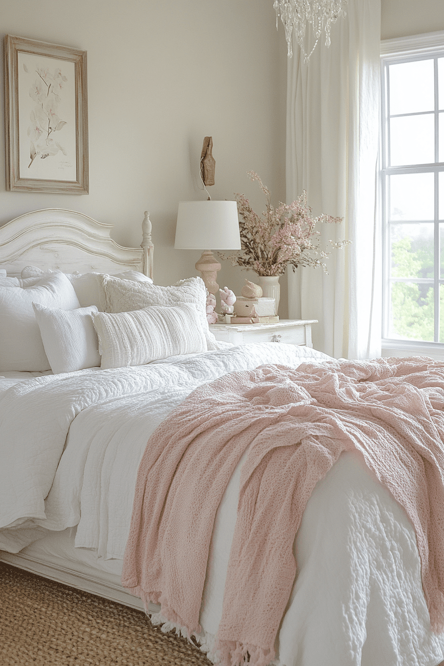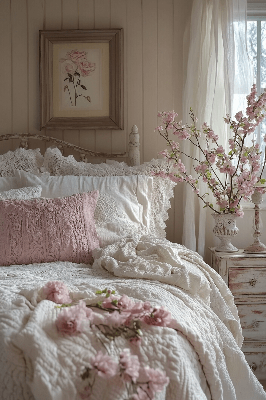 Soft blush tones create a dreamy and romantic atmosphere that feels warm and inviting. This shabby chic bedroom uses gentle pink hues to establish a serene and feminine foundation. Delicate textures enhance the overall softness and charm. Vintage furniture adds character while maintaining the romantic theme. Every detail contributes to a peaceful and enchanting environment. Discover more blush-toned shabby chic bedroom inspiration.
