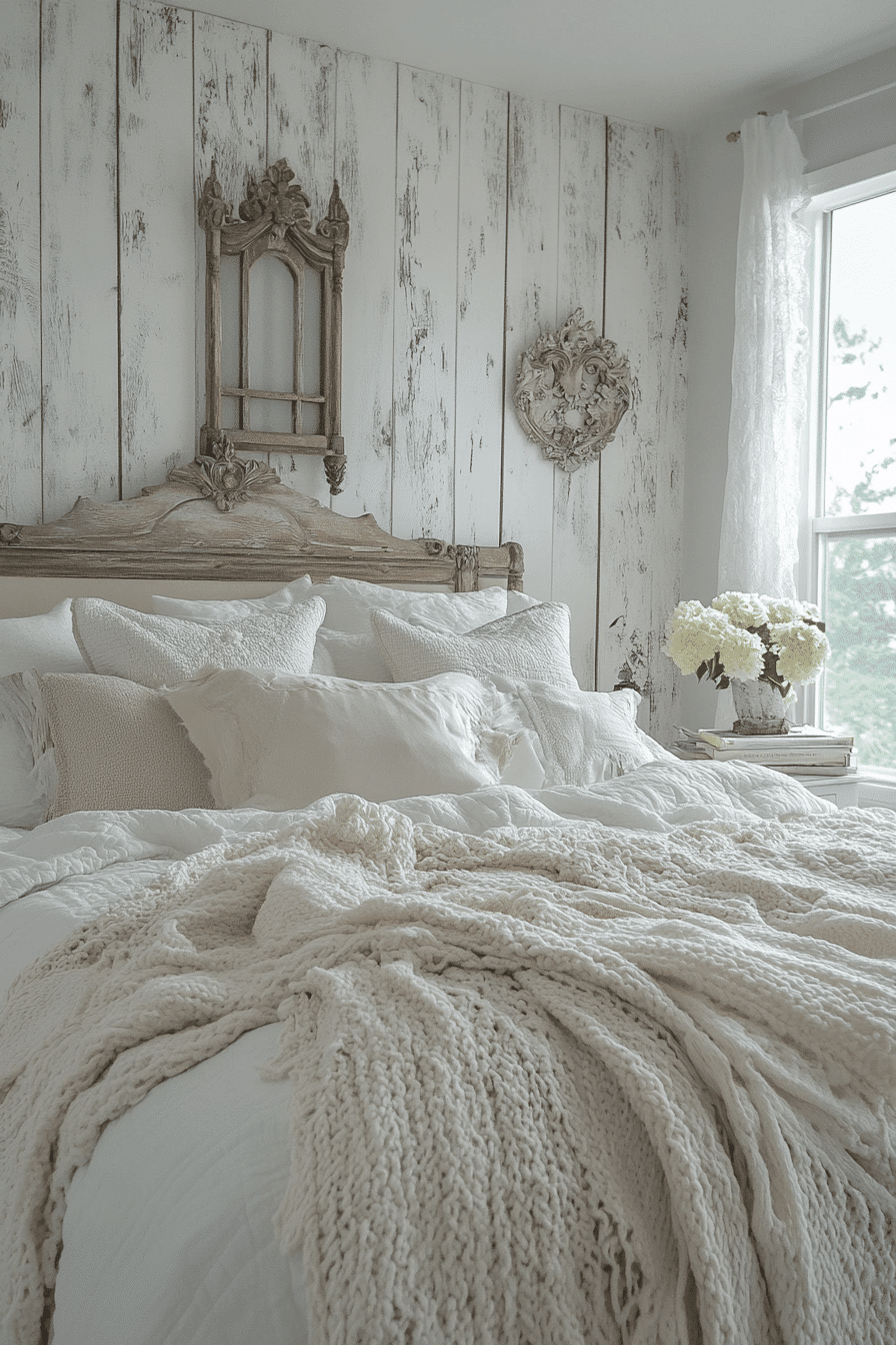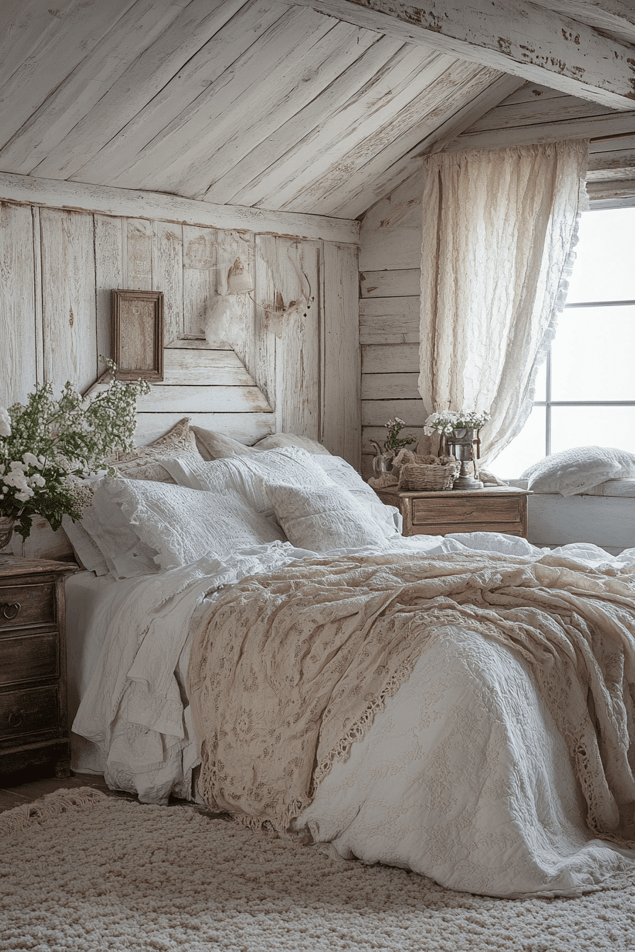 Whitewashed finishes create a calm and airy bedroom that feels fresh and timeless. This shabby chic bedroom uses weathered white furniture to establish vintage charm. Soft linens and delicate accessories complete the serene look. Natural light enhances the peaceful atmosphere throughout. The design feels both relaxing and romantically appealing. Explore more whitewashed shabby chic bedroom inspiration.