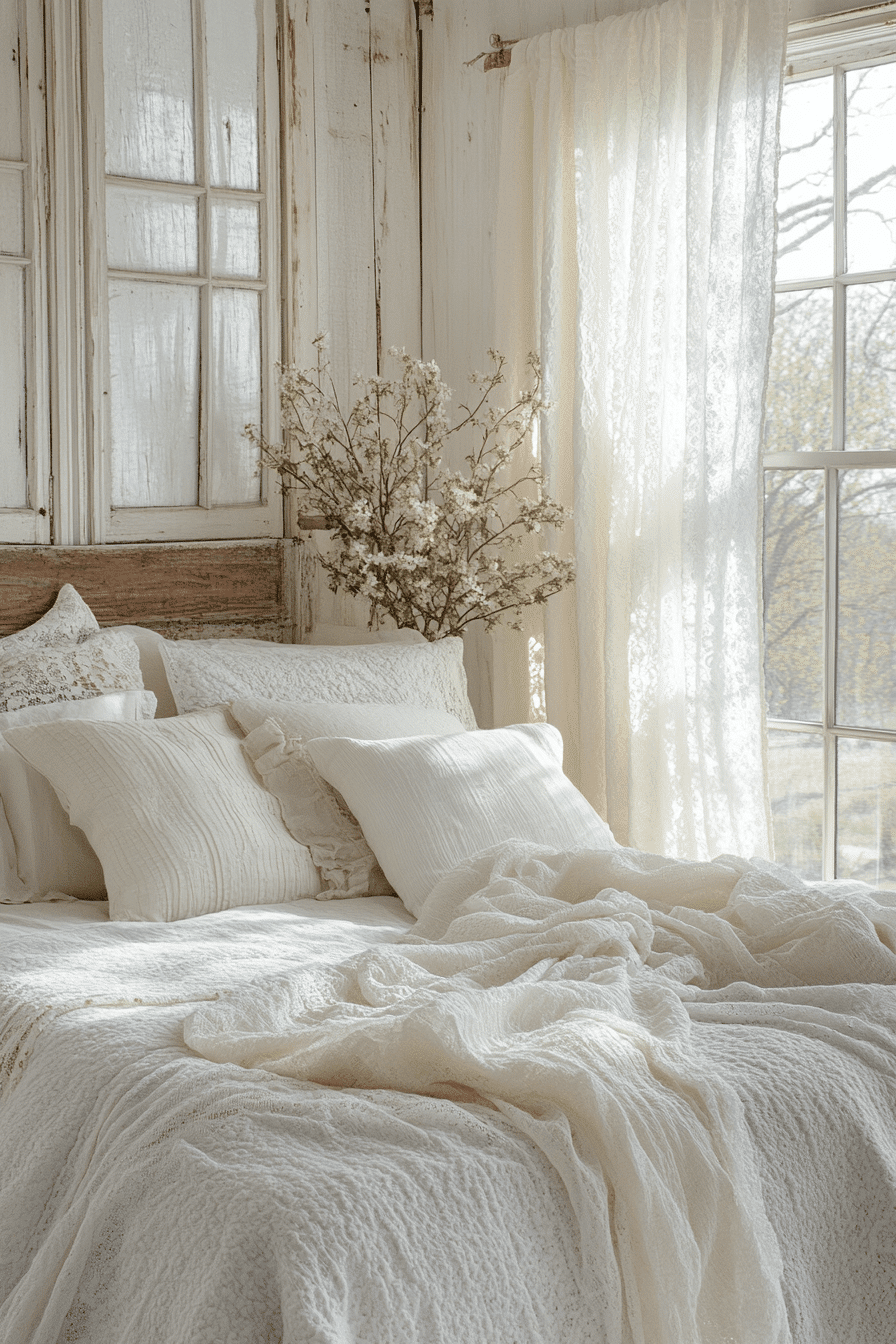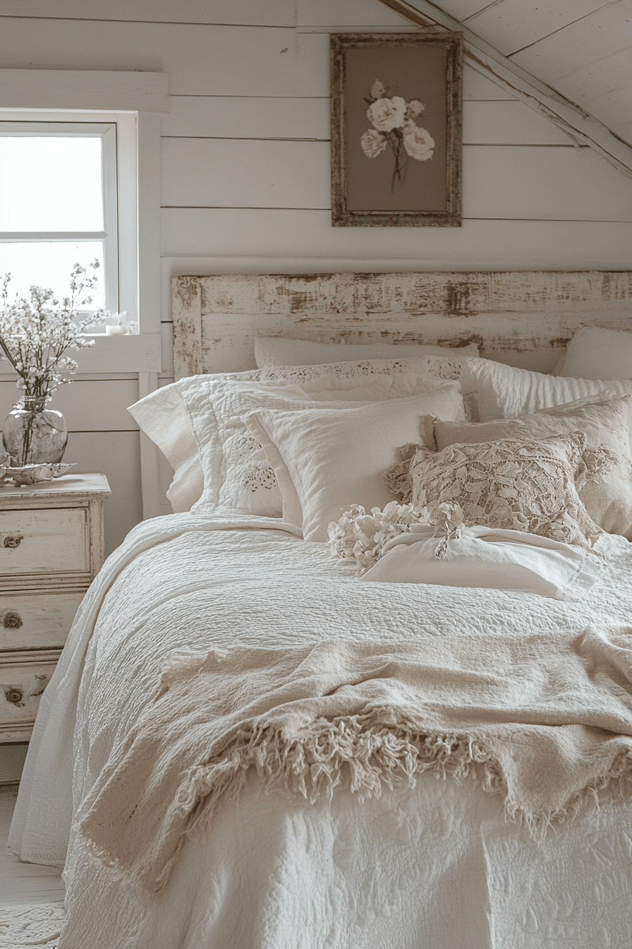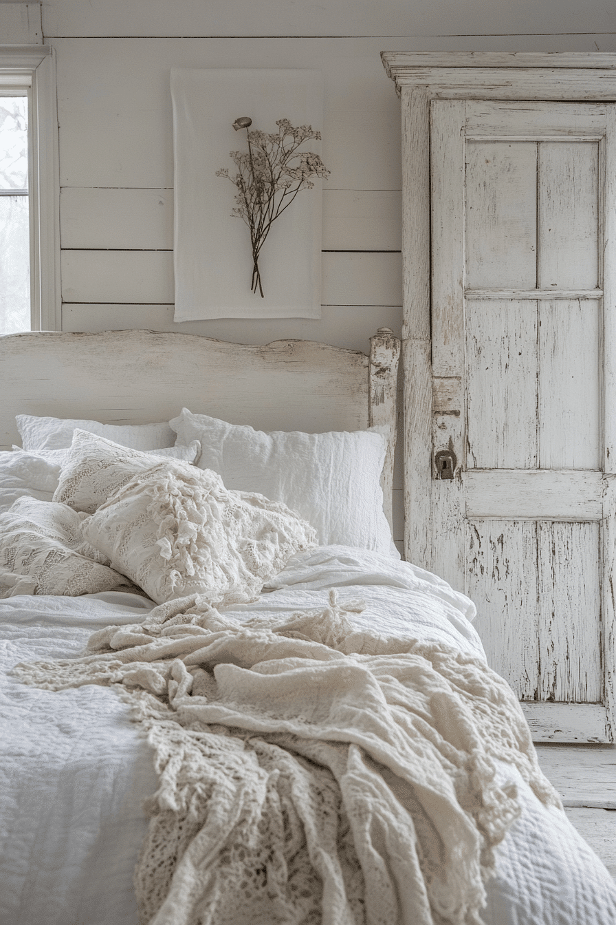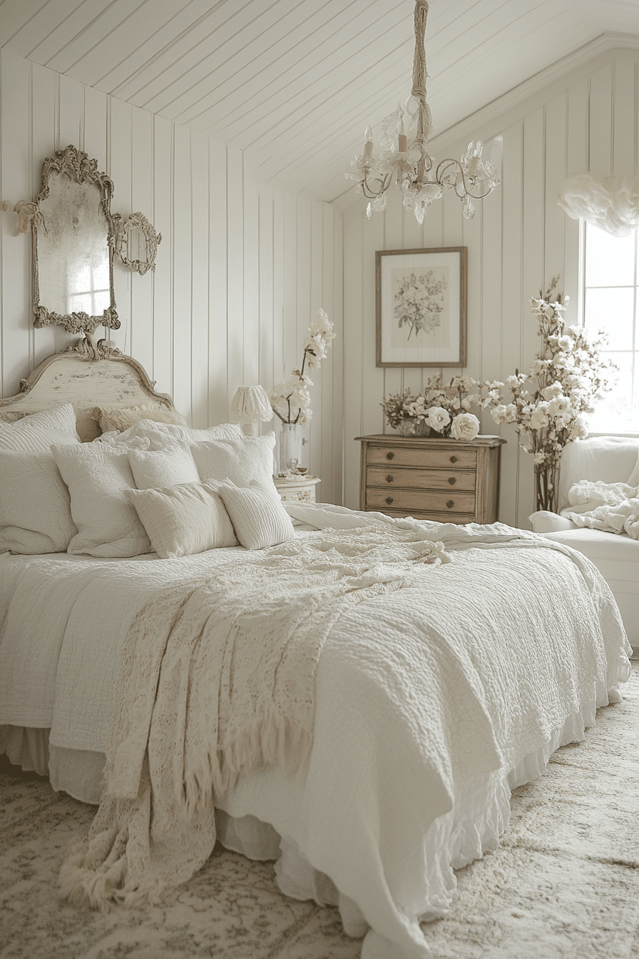 Whisper-soft whites create a cozy bedroom that feels pure and romantically inviting. This shabby chic bedroom uses various white tones for depth and interest. Vintage furniture and soft textures add character and warmth. The space feels like a gentle embrace of comfort. Every element contributes to a serene and cozy atmosphere. Explore more white-whisper shabby chic bedroom inspiration.