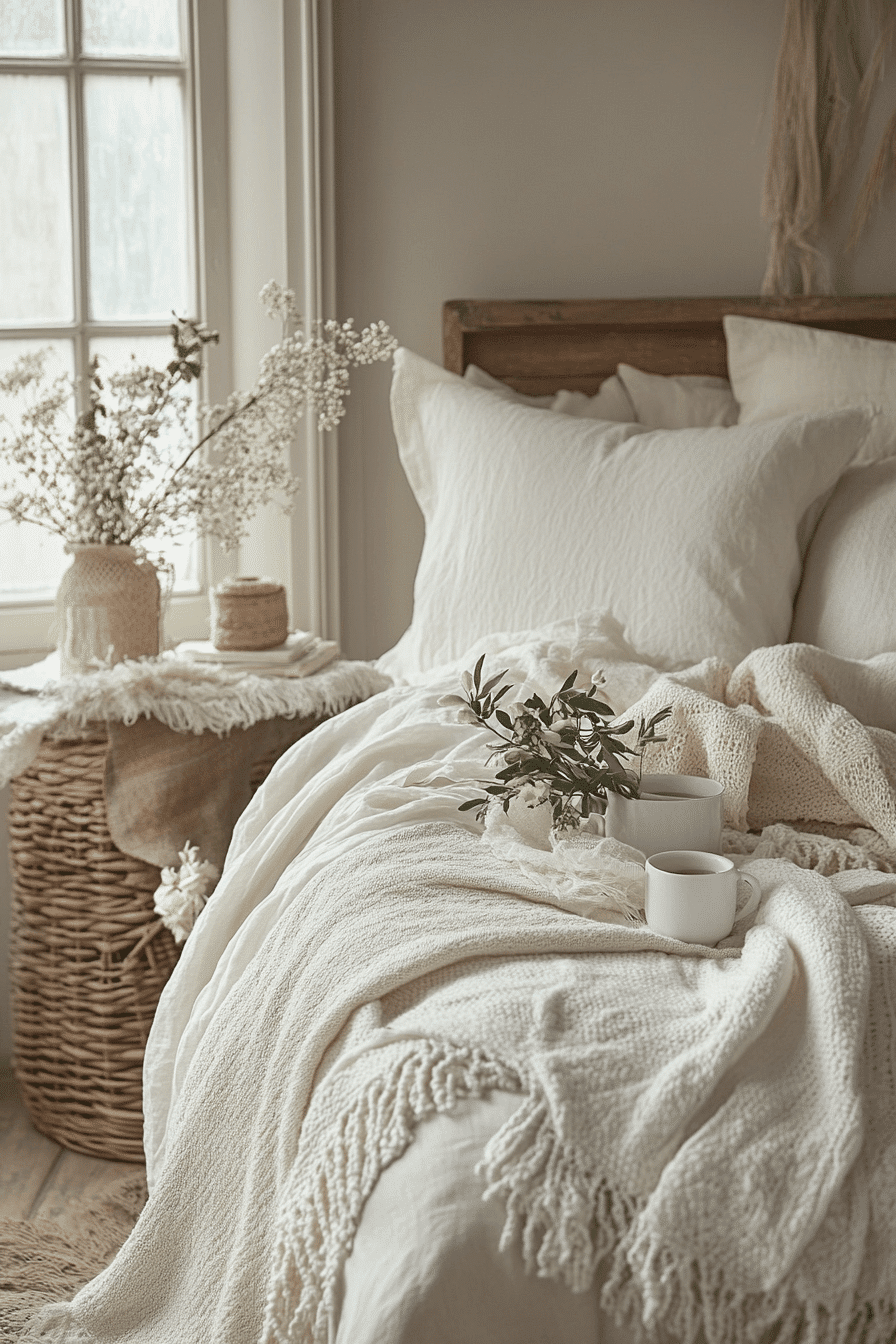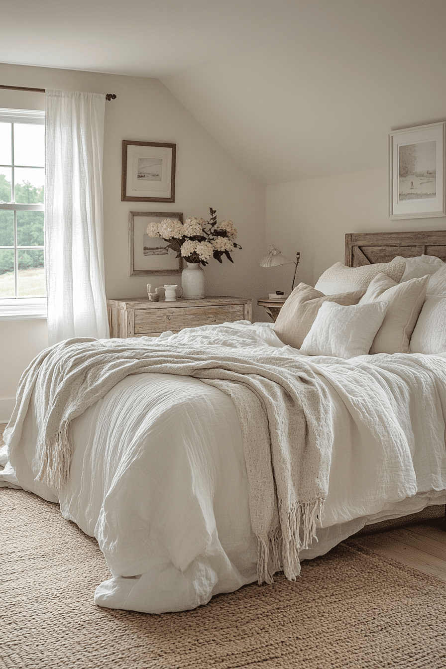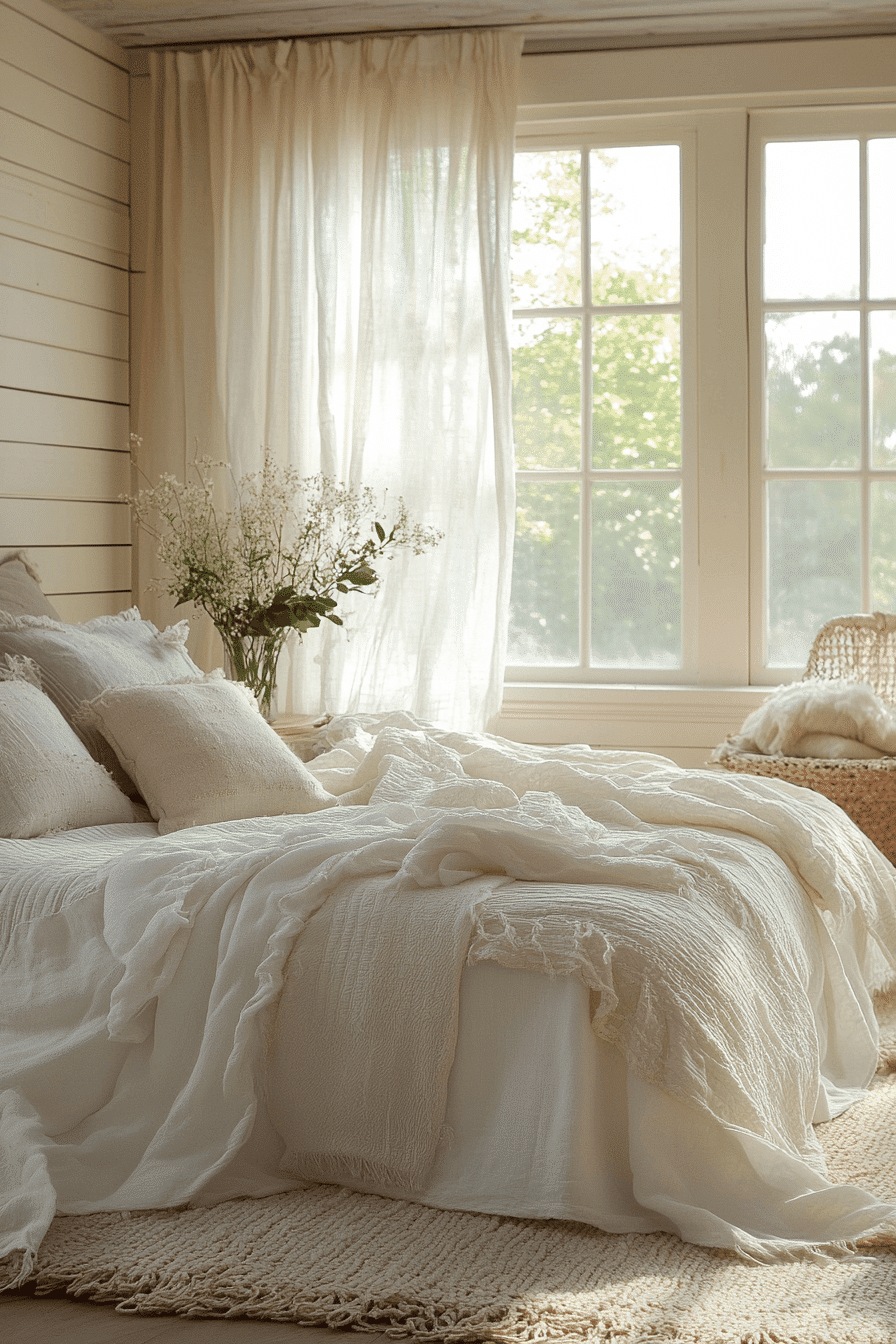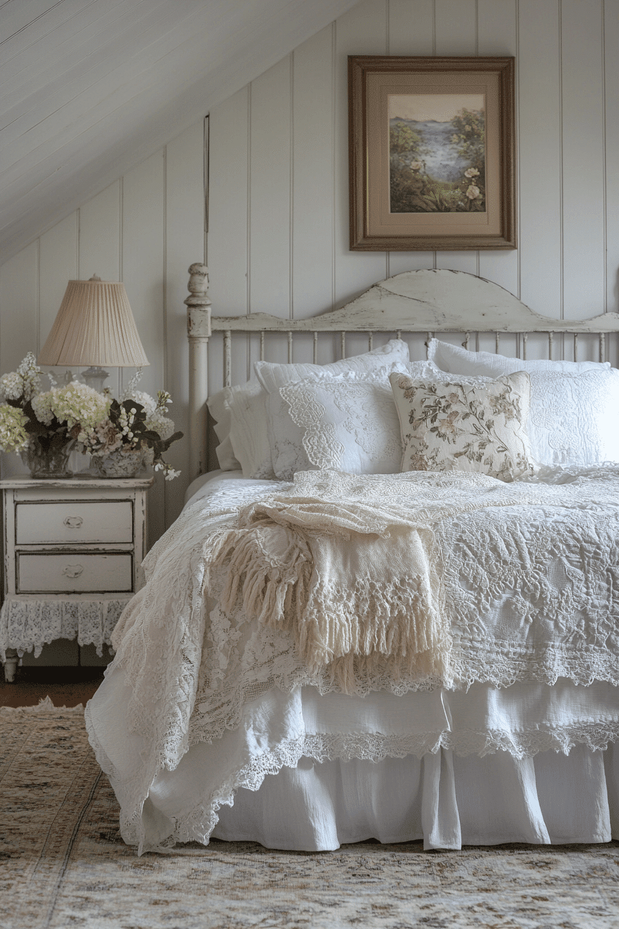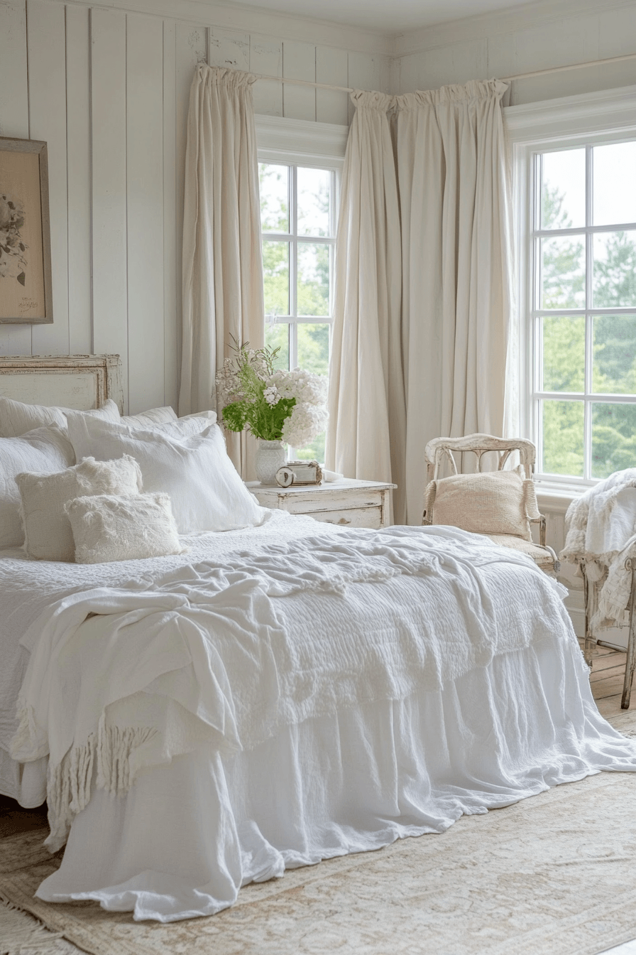 Whisper-soft whites create a cozy bedroom that feels pure and romantically inviting. This shabby chic bedroom uses various white tones for depth and interest. Vintage furniture and soft textures add character and warmth. The space feels like a gentle embrace of comfort. Every element contributes to a serene and cozy atmosphere. Explore more white-whisper shabby chic bedroom inspiration.