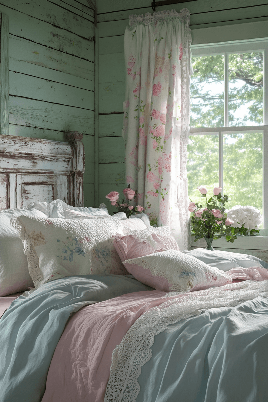 Gentle pastel colors create a serene and peaceful bedroom environment that feels like a dreamy escape. This shabby chic bedroom incorporates soft lavender, mint, and blush tones beautifully. Delicate fabrics and vintage furniture enhance the romantic aesthetic. Light filters gently through the space, creating a magical atmosphere. Every element contributes to tranquil beauty. Discover more pastel shabby chic bedroom ideas.
