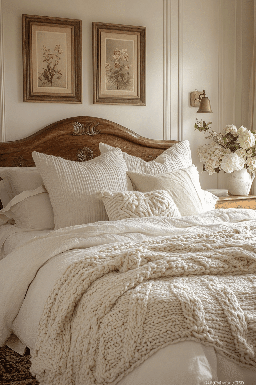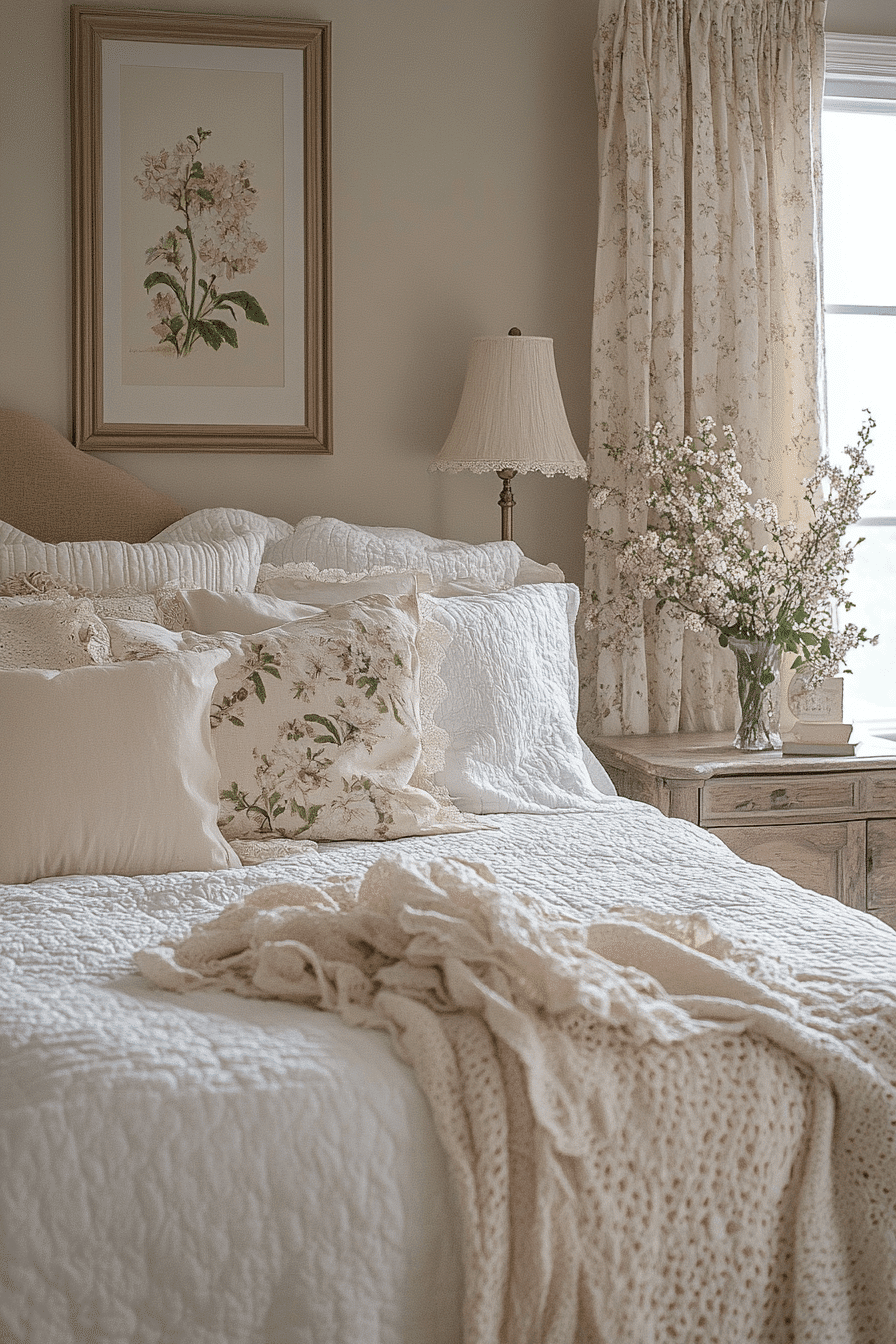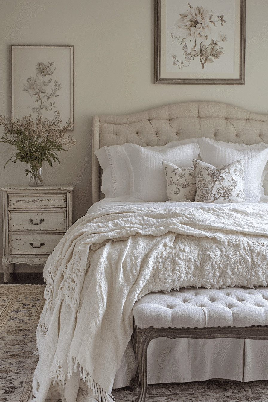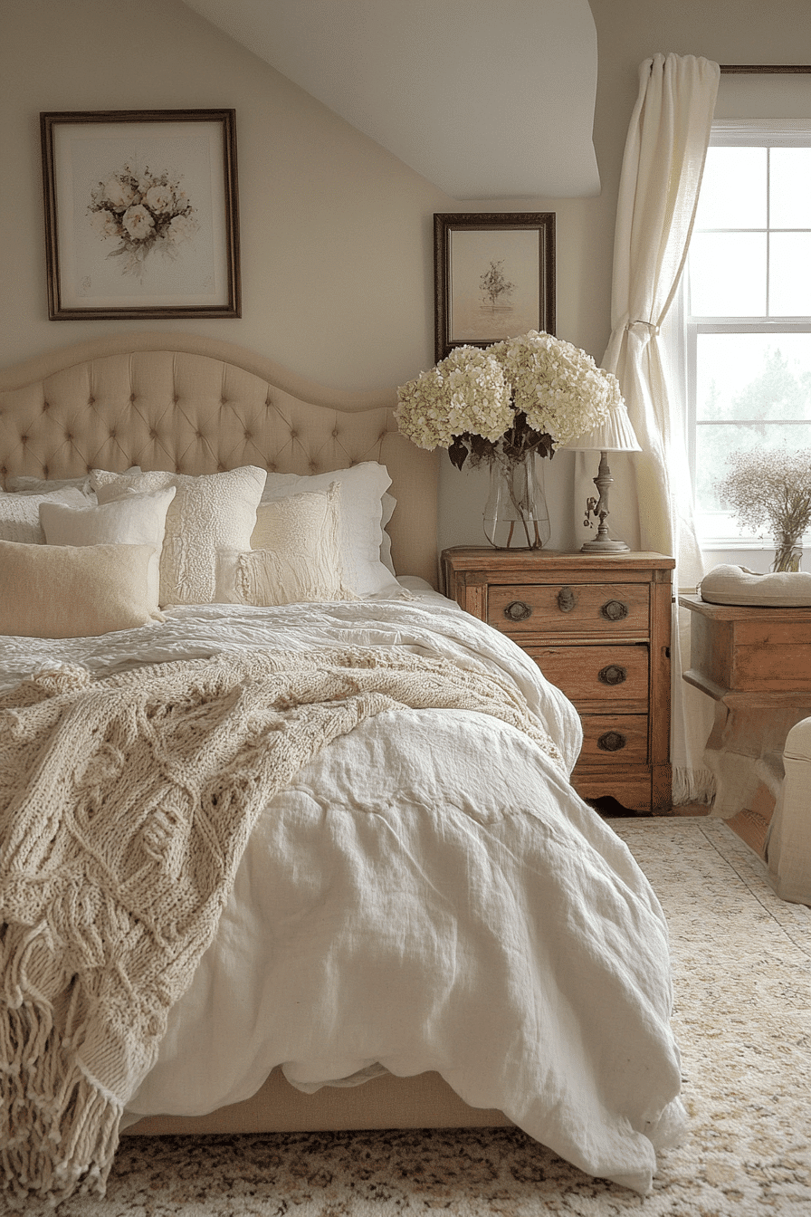 Ivory tones create a calm bedroom that feels cozy and timelessly elegant. This shabby chic bedroom uses warm ivory hues throughout the design. Vintage furniture and soft textures add character and comfort. The space feels like a peaceful retreat from everyday stress. Every element contributes to a harmonious and soothing environment. Find more ivory-toned shabby chic bedroom inspiration.