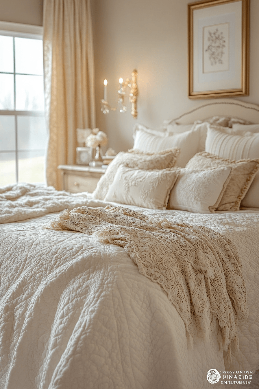 Pearl-like tones create a sophisticated bedroom with a soft and luminous quality. This shabby chic bedroom uses iridescent and cream colors for elegance. Vintage furniture and delicate accessories complete the refined look. Gentle lighting enhances the pearl-like glow throughout the space. Every element contributes to a serene and sophisticated atmosphere. Explore more pearl-toned shabby chic bedroom inspiration.