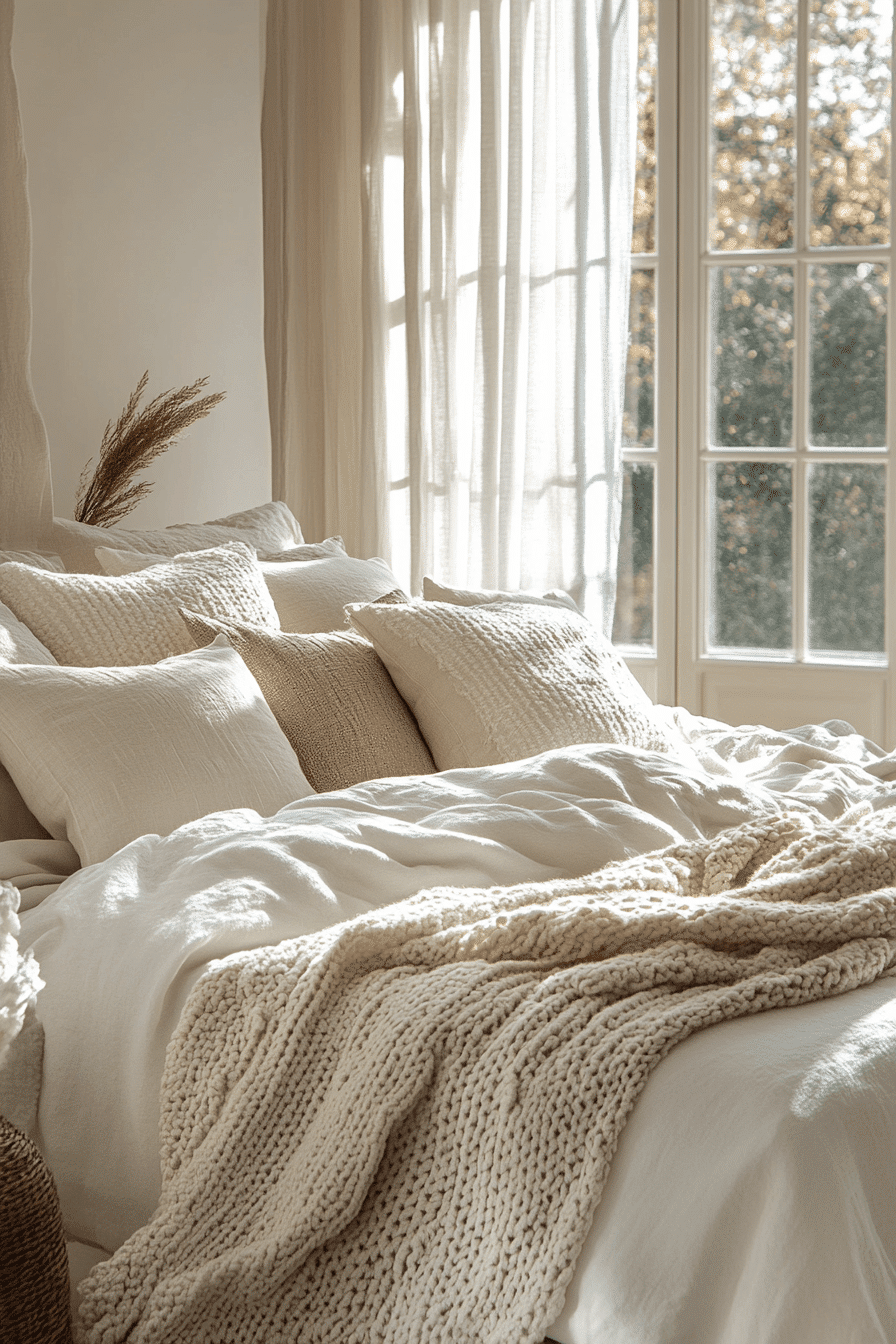 Layered bedding and fabrics create a comfortable bedroom that feels luxurious and inviting. This shabby chic bedroom emphasizes comfort through multiple textile layers. Vintage furniture and soft colors enhance the cozy aesthetic. The space feels like a warm embrace and restful retreat. Every element contributes to ultimate comfort and relaxation. Explore more layered shabby chic bedroom ideas.
