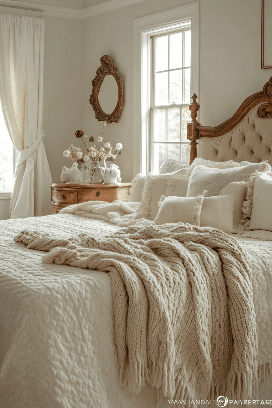 Warm neutral tones create a cozy and welcoming bedroom that feels balanced and harmonious. This shabby chic bedroom uses beiges, creams, and soft taupes for a soothing palette. Natural textures add depth and interest throughout the space. Vintage elements provide character and authenticity. Every detail supports a calm and restful atmosphere. Find more neutral shabby chic bedroom inspiration.